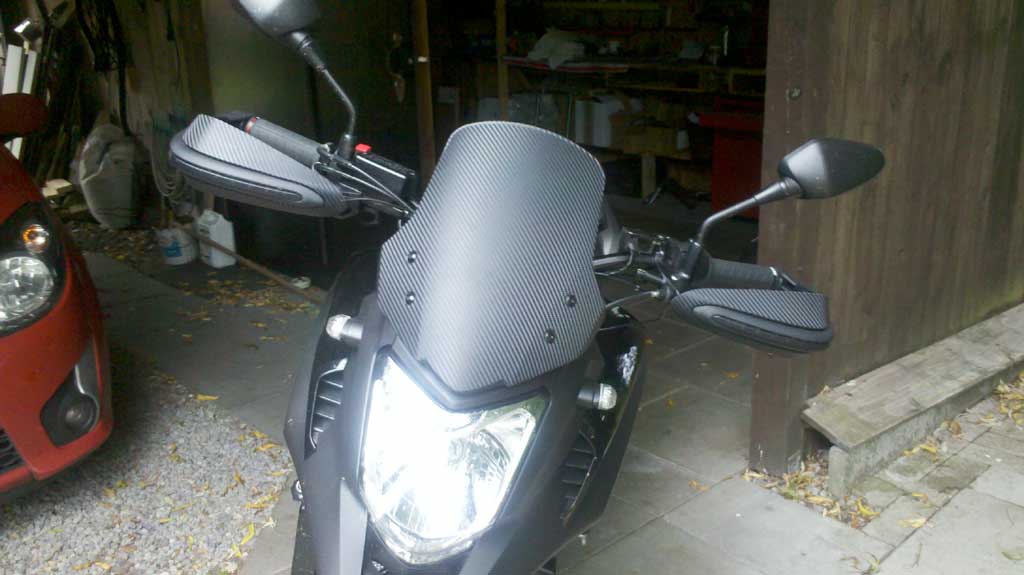 Ich habe die Scheibe und die Handprotektoren mit Carbon-Folie beklebt. Für meine ersten Versuche damit finde ich es recht gelungen.