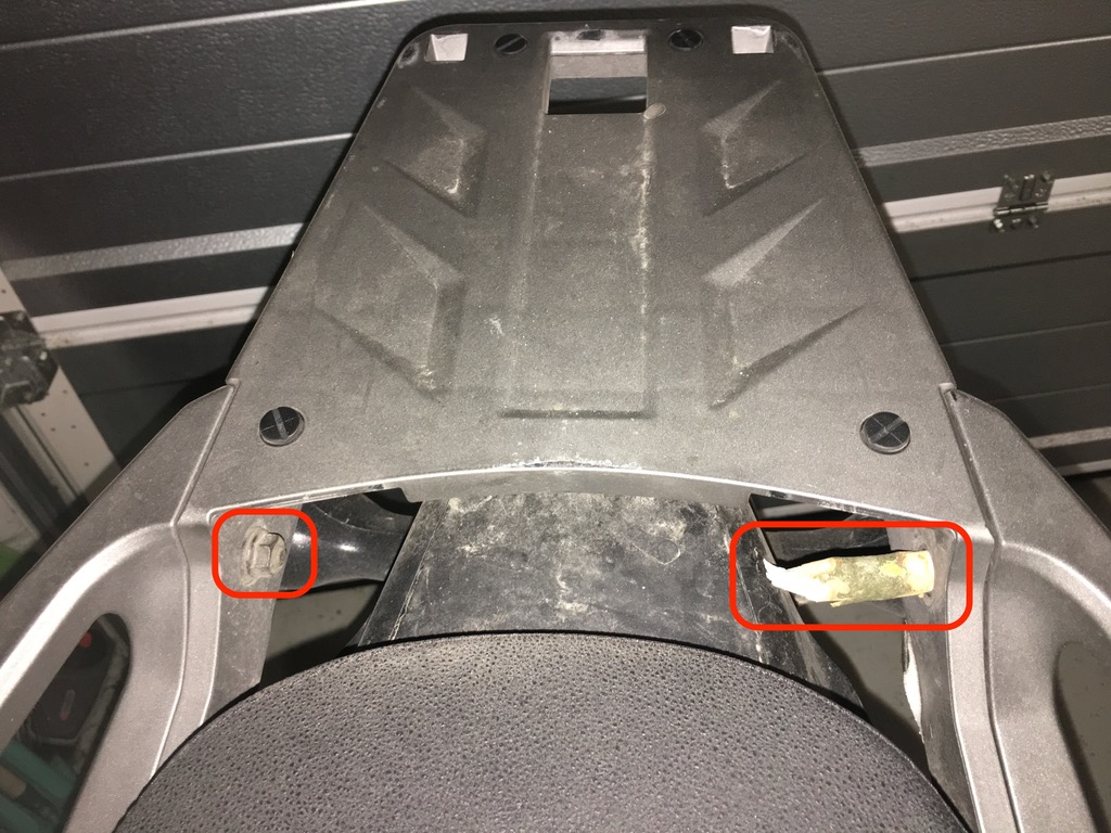 Was ist passiert: unterwegs gab es beim Überfahren eines Bahnüberganges einen Knall, und bei der nächsten Pause stelle ich fest, dass die Schraube bei der Gepäckbrücke abgebrochen war und verloren gegangen ist. Notbehelfsmässig musste ein Ast in der Nähe des Parkplatzes dran glauben, mit dem Sackmesser zurechtgeschnitzt, hält das Topcase so den Rest meiner Tour durch's Elsass durch. Ist aber nicht wirklich schön ![]()