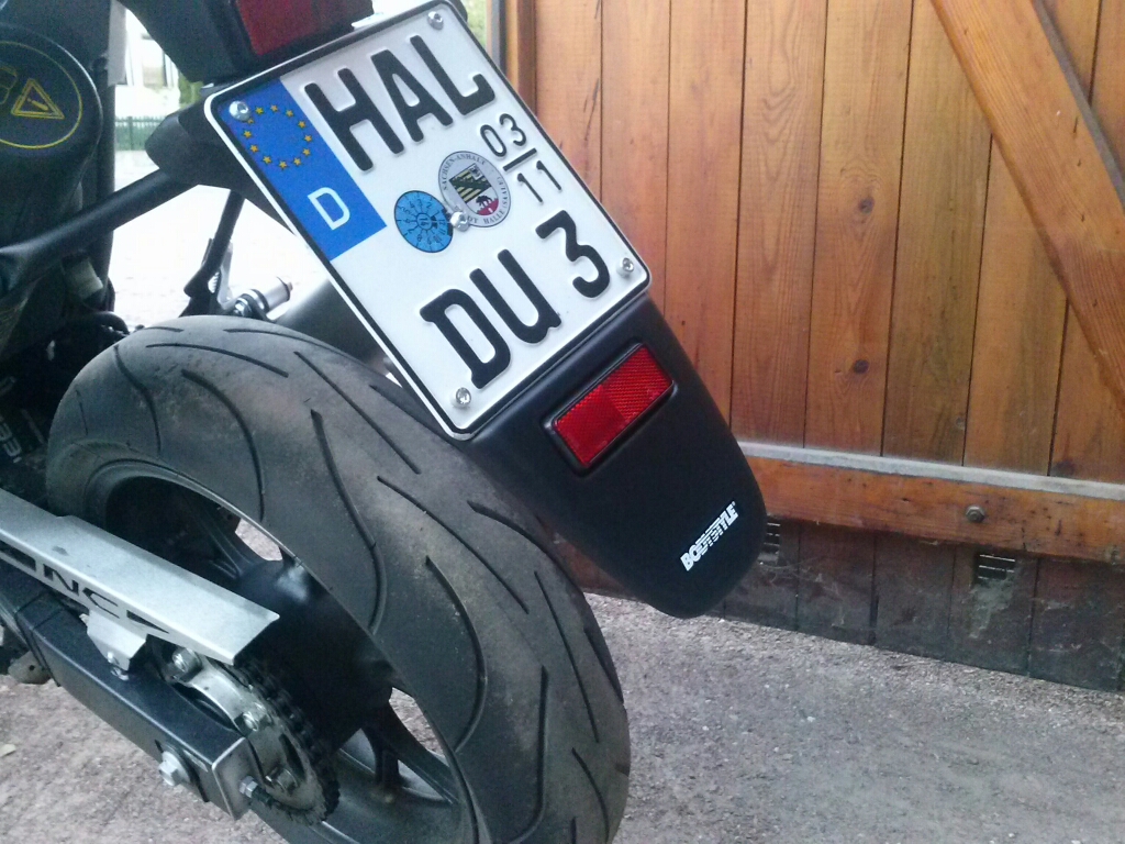 Der Hintergrung für meine Farge ist, das ich mein Heck umgebaut habe mit Kellermann Rücklich/Blinkern und kurzem Nummenschildträger. Nachteil bei der Sache ist, bei Regen werde ich von Hinten komplett eingesaut.