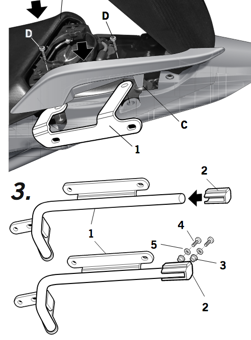 wenn ich mir die beiden Aufbauanleitungen anschaue, werden beide Male die Befestigungen erstmal unter dem Soziussitz/Haltegriff verbaut, ich dachte, da ich ja schon den Gepäckträger habe, entfällt es, da muss ich mir ja sorgen machen ob ich das beides überhaupt unter dem Soziussitz platzieren kann. Ich dachte mir easy, ich platziere wie auf Bild 2 , Nummer 3, direkt am bestehenden Trägersystem. Ich hab irgendwie das Gefühl, dass ich auf Bild 2 (den Träger Nr.1) gar nicht benötige, aber dann würde es ja überhaupt keinen Sinn machen, zuerst das 3 P System unter dem Haltegriff zu montieren, es würde mir ja alles weitere schon verbauen.