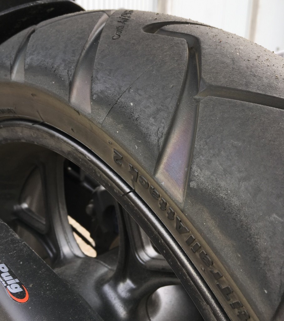 Der BT 30 EVO (hinten) hat nun nach 12.500 km die Verschleißgrenze erreicht. Der wird bis kommende Woche noch 1.000 km laufen müssen und wird dann gewechselt. Der Vorderreifen dürfte 3 - 4.000 km länger halten. -