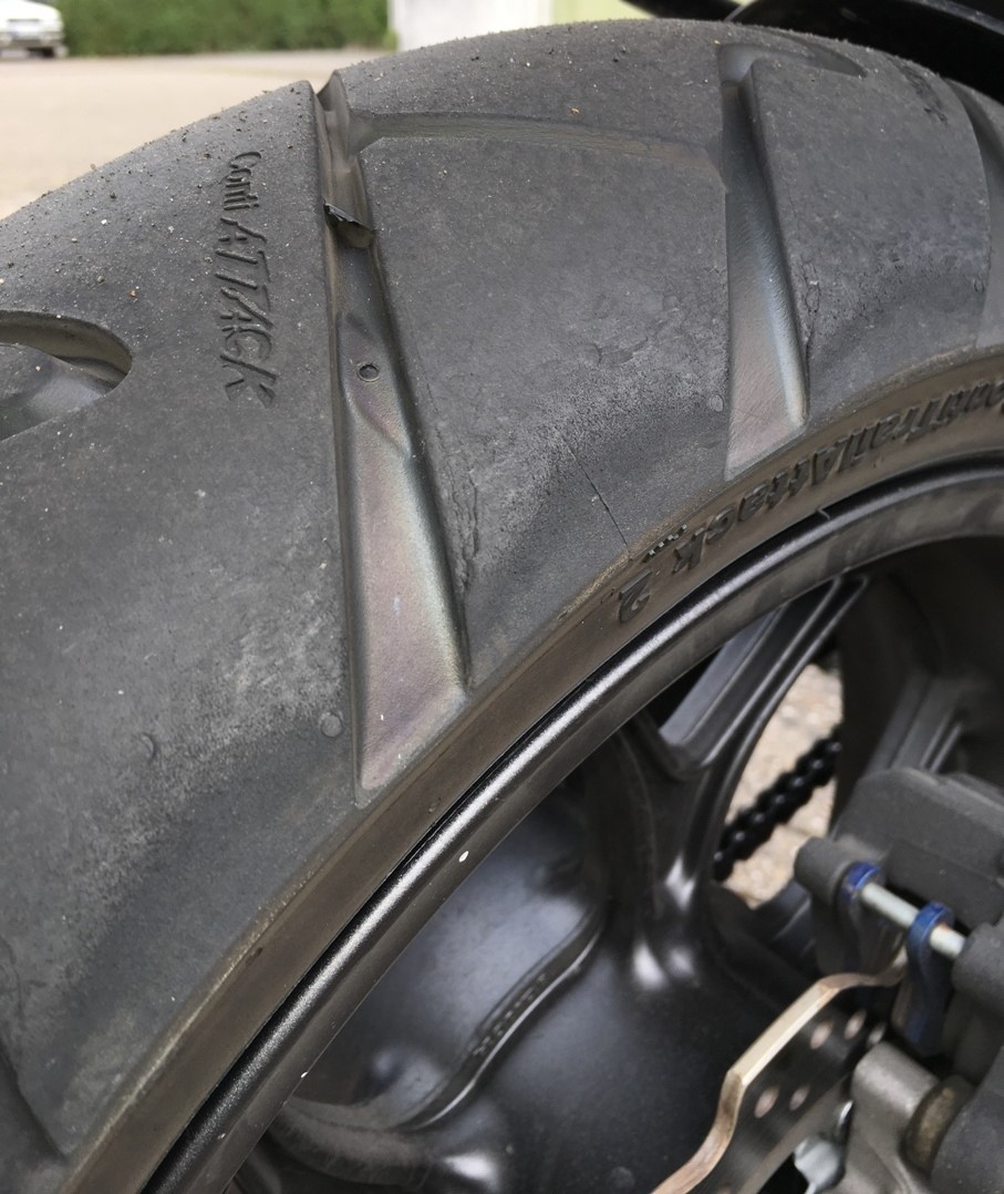 Was ggf. für eine gute Verschleißwertung spricht, ist die Tatsache, dass der "Conti Attack" Schriftzug auf der Lauffläche nach nun fast 700km noch immer deutlich zu erkennen ist...