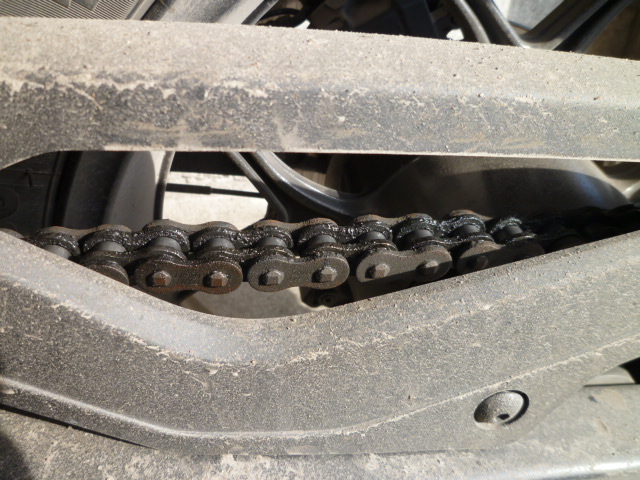 Im Scottoiler ist das blaue Öl eingefüllt, die Tropfrate auf 120 s eingestellt. Die Kette wird an den Rollen bestens geölt, ebenso die Zähne des hinteren Kettenrades. Die Laschen sind von außen angerostet, sieht nicht schön aus, ist aber für die Funktion unerheblich.