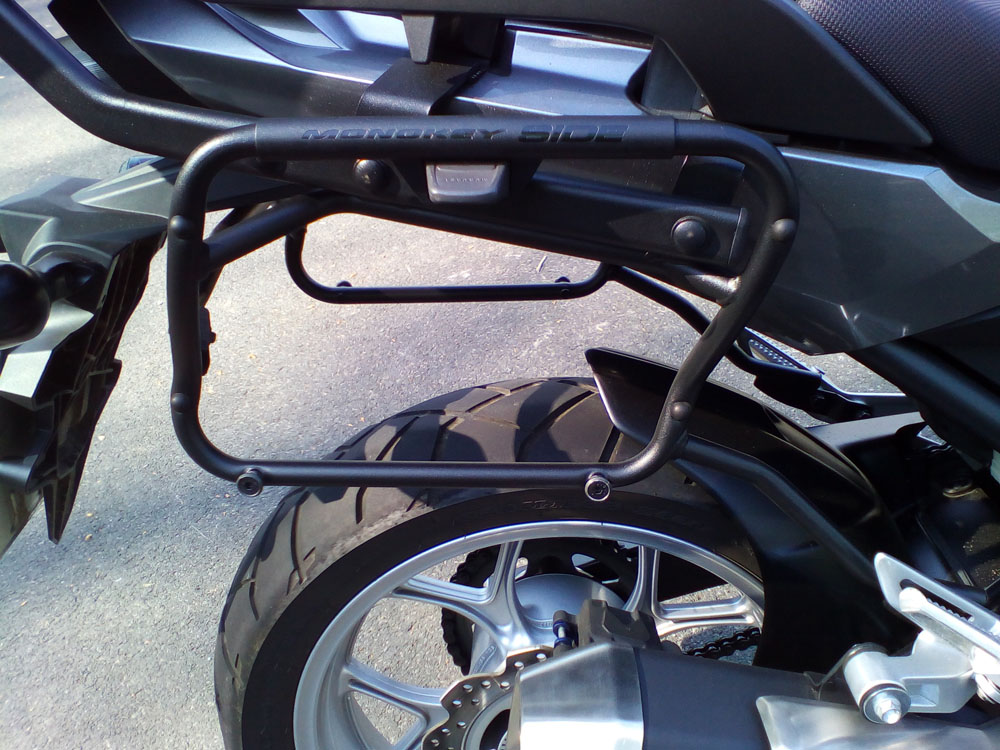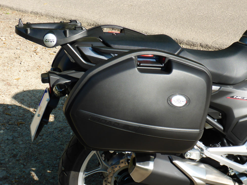 Als Seitenkoffer passen nur die o. a. Modelle Givi V35N oder Kappa K33N, da es sich hier um ein verbessertes Monokey-System (Monokey SIDE) mit fünf Aufnahmepunkten handelt. Das herkömmliche Monokey-System bietet nur drei Aufnahmepunkte.