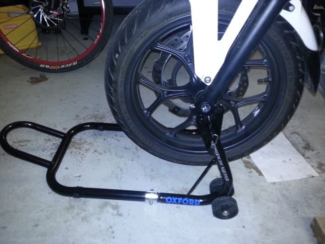 Hier mein Oxford Montageständer beim heutigen Reifenwechsel. Das Motorrad hat den ganzen Tag über auf den beiden Montageständern gestanden, die haben das Gewicht gut ausgehalten. Gegen Abend habe ich die Räder mit den neuen Reifen wieder eingebaut. Hat alles ohne Probleme geklappt.