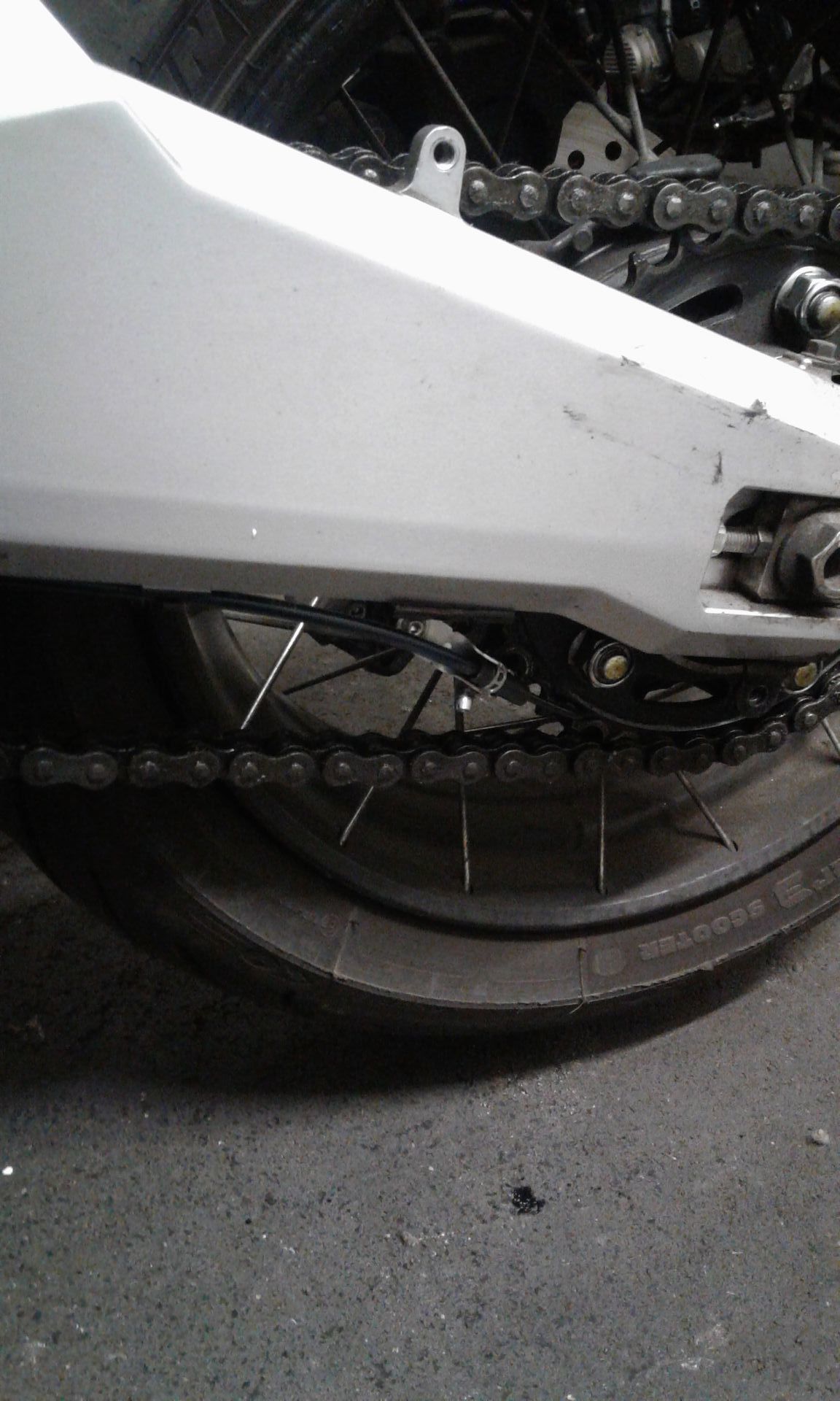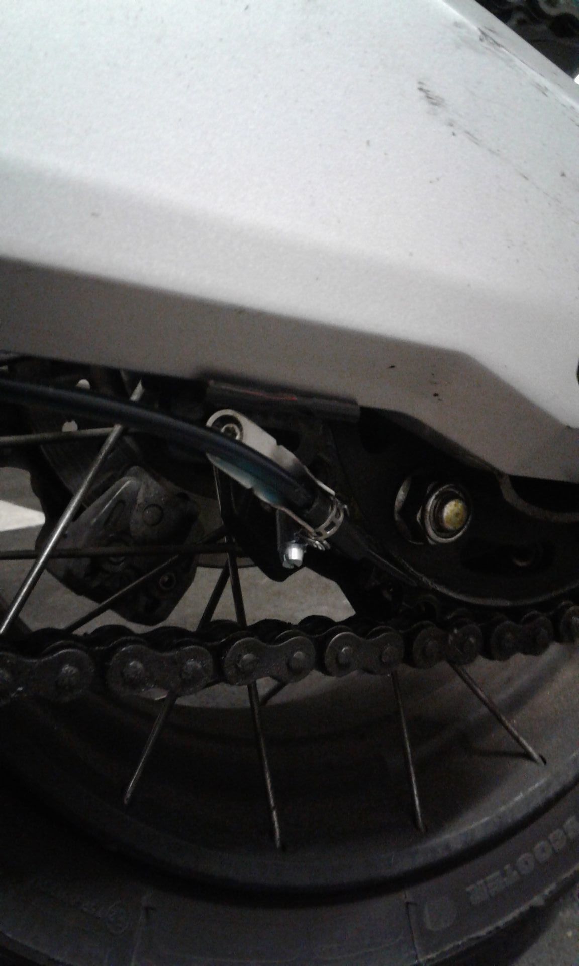 Die Spendereinheit habe ich hinter der linken hinteren Fußraste mit zwei Selbstschneidschrauben an die Verkleidung geschraubt. Der Spenderschlauch ist hinter der Fußrastenabdeckung versteckt und an der Unterseite der Schwinge angeklebt. Der Kettenschutz muss einer Stelle ein wenig bearbeitet werden um Platz für die Halterung der Düse zu schaffen. Die Bilder hab ich vor der Montage des Kettenschutzes gemacht.