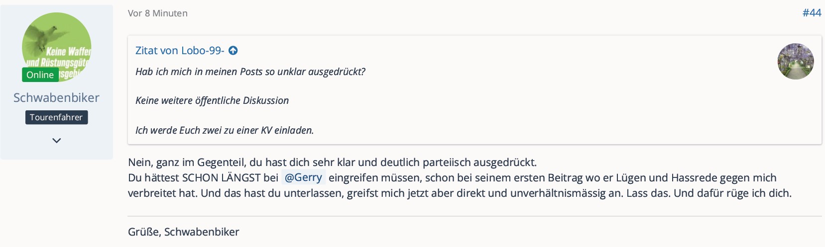 #90 Alles anzeigenAn deiner KV werde ich nicht teilnehmen, weil du parteiisch bist, ich habe dir das schon begründet, du hast es halt gelöscht weil es dir natürlich unangenehm ist. Doch anbei der Screenshot vor deiner Löschung.