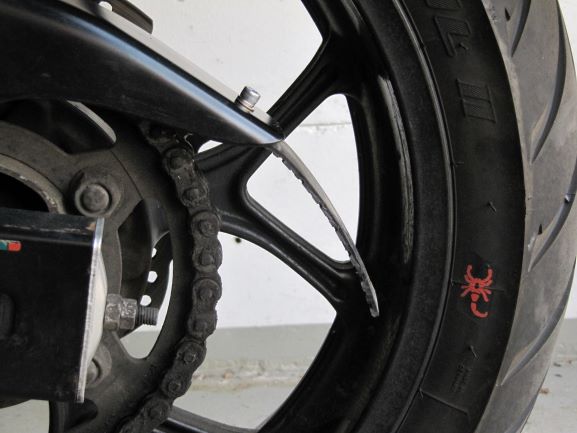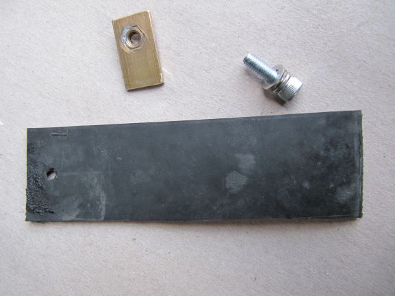 Zu Bild 1: Aus einem alten Regenüberschuh, der vorne unten eine Gummisohle hatte, stammt der Streifen, 14cm lang und 3,5cm breit. Die Breite würde auch in den originalen Kettenschutz passen, ich habe das Teil von bodystyle. Der Messingstreifen mit eingelöteter Messingmutter stammt aus einer früheren Bastelei. Ein Loch war so ausgefeilt, dass die Mutter bündig abschließt. Anschließend verlötet, damit man sich im Fall der Fälle das mühsame Festziehen der Mutter im Dreck erspart. Schließlich eine Schraube M5 mit Unterlegscheibe und Federring.