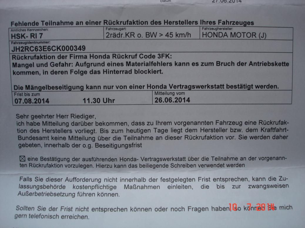 Nachdem ich irgendwann im Herbst 2012 ebenfalls Post von Honda bez. des Rückrufes bekommen habe, Honda per mail unter Beifügen von Bildern mitgeteilt habe, dass meine X mit D.I.D.-Kette nicht betroffen ist, ich seitdem nichts mehr gehört habe, gabs nach jetzt fast zwei (!) Jahren Post von der örtlichen Zulassungsstelle, in der man mich aufgefordert hat, die Beseitigung des Mangels bis zum 07.08.2014 nachzuweisen.