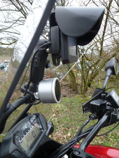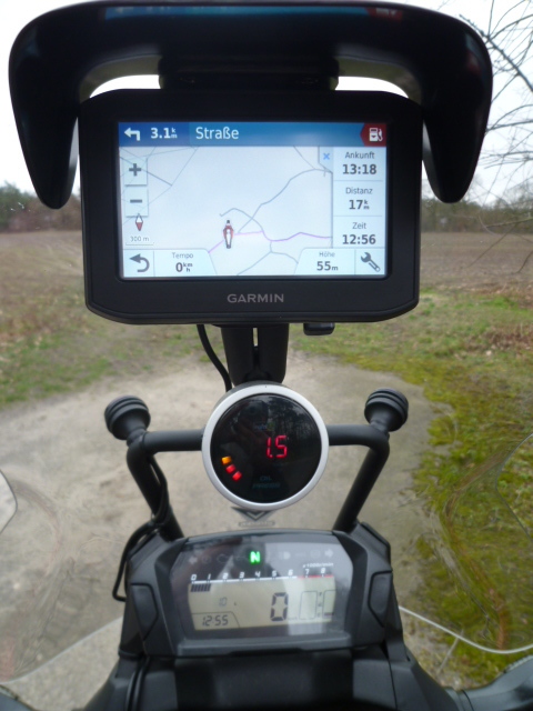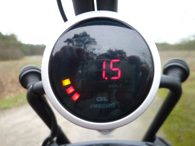 Vorweg einige Angaben. Der Öldruckmesser ist von Raid HP und eigentlich für Autos gedacht. Der Einbau des Instrumentes in geschützter Lage hinter der Scheibe über der Instrumentenkonsole sollte die fehlende Wasserdichtigkeit ausgleichen. Als Instrumentenbecher habe ich einen silbernen Verschlußdeckel einer Sprühdose genommen, sieht gut aus und funktioniert.