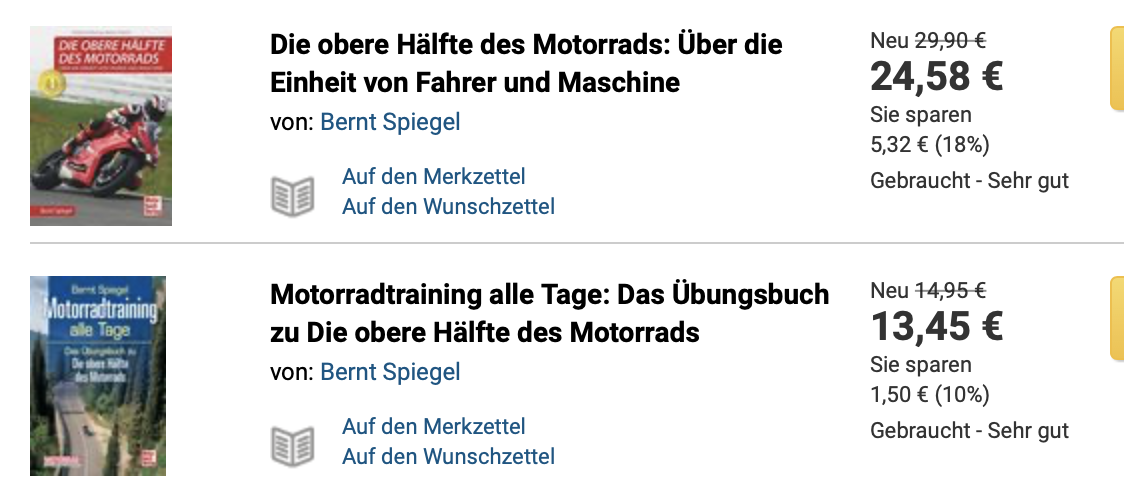 Bernt Spiegel kostet einen gerade für die ersten 50 Seiten etwas Durchhaltevermögen. Man kann sie auch weglassen oder später lesen. Aber danach und auch nach den Übungen im zweiten Buch fängt das Motorradfahren in einer neuen Dimension am.