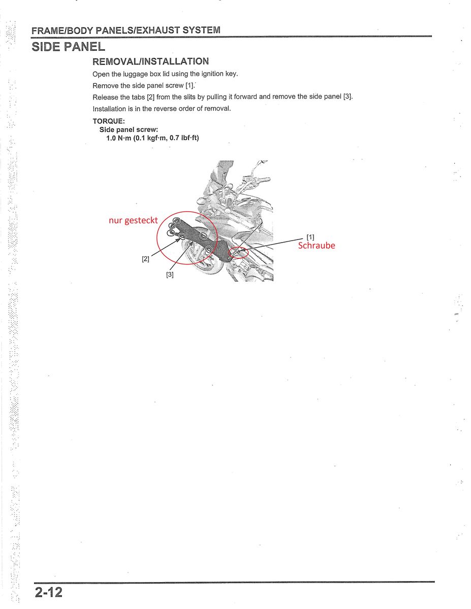 Bei Youtube findest du unter "Honda NC750S Bodywork Panel Removal" ein im Schnitt etwas durcheinandergeratenes Video. Bei meiner DODO waren die Verkleidungsschrauben extrem festgeknallt. Durch die geringe Werkzeugeingriffstiefe ist ein scharfkantiger Inbusschlüssel nötig, um den Eingriff nicht zu beschädigen. Mit dem vorgeschriebenen Mickermoment angezoge Schrauben vibrieren sich los > flüssige Schraubensicherung hilft gegen Verlust von 5€-Schrauben ...