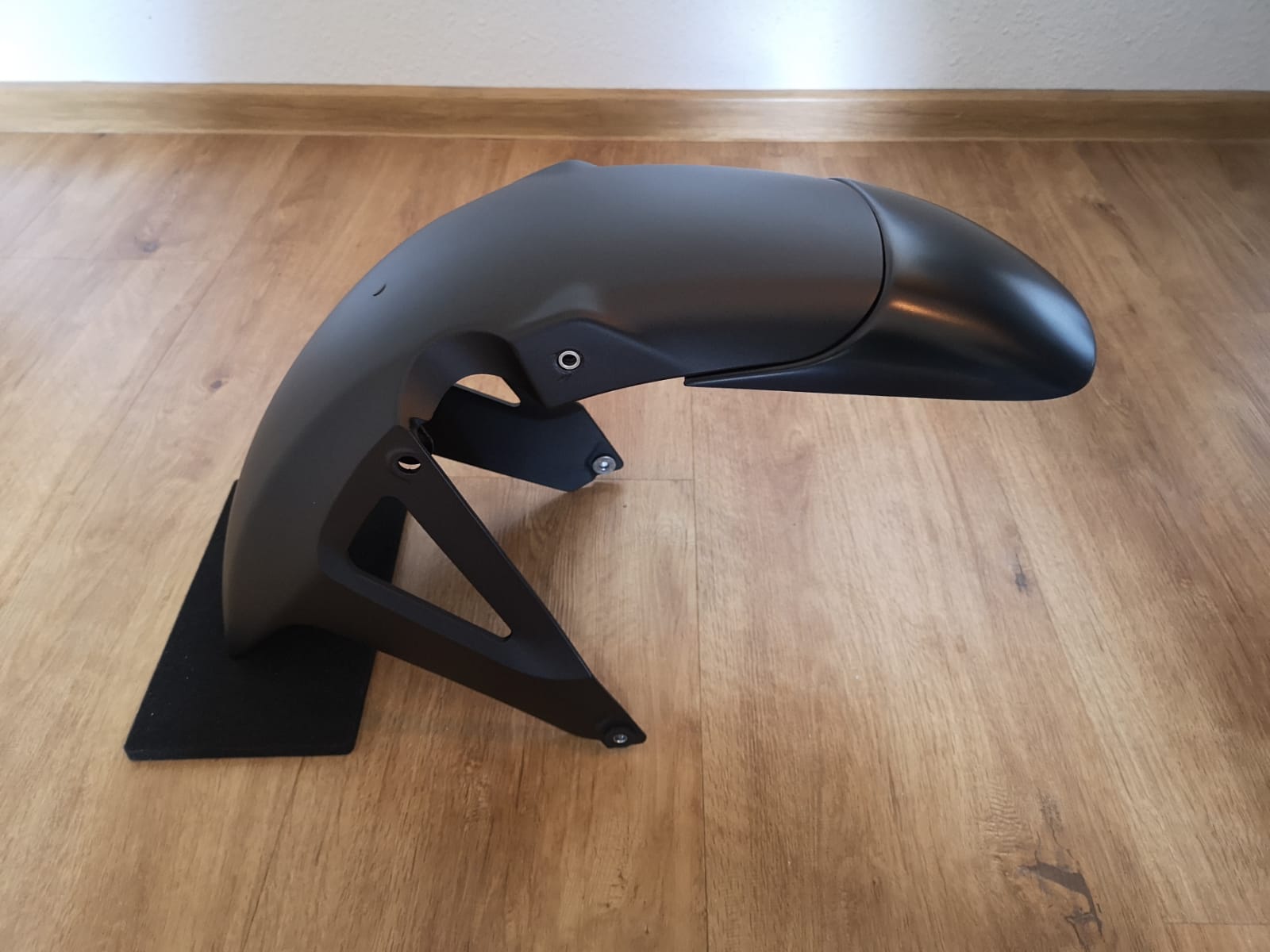 Als Montagezubehör wird unter anderem auch eine "Gummimatte" mitgeliefert welche ich in der Breite etwas gekürzt habe. Diese kommt zwischen Gabel und eigentlichen Protektor als Schutz. Die war aber zu breit, so dass sie unten herausgeguckt hätte. fand ich nicht schön deshalb habe ich die mit einem Cuttermesser längs etwas schmaler gemacht. So schließt das, wie ich finde, optisch ganz gut ab.