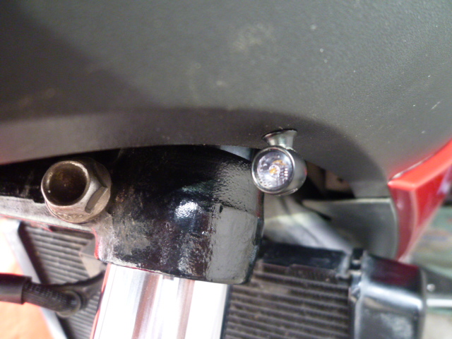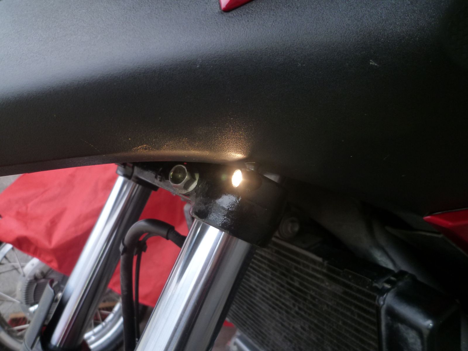 Also blieben noch Positionslichter, die als Pärchen angebaut werden dürfen. Gekauft habe ich dann welche von Kellermann, Modell Atto. Angeschlossen habe ich sie an das Standlicht damit sie mit einschalten der Zündung sofort leuchten. An der Unterseite der vorderen Verkleidung etwa in Höhe der Standrohre fand sich ein den Einbauvorschriften entsprechender Platz. Da sie sehr klein sind fallen sie kaum auf, leuchten aber dennoch sehr hell.