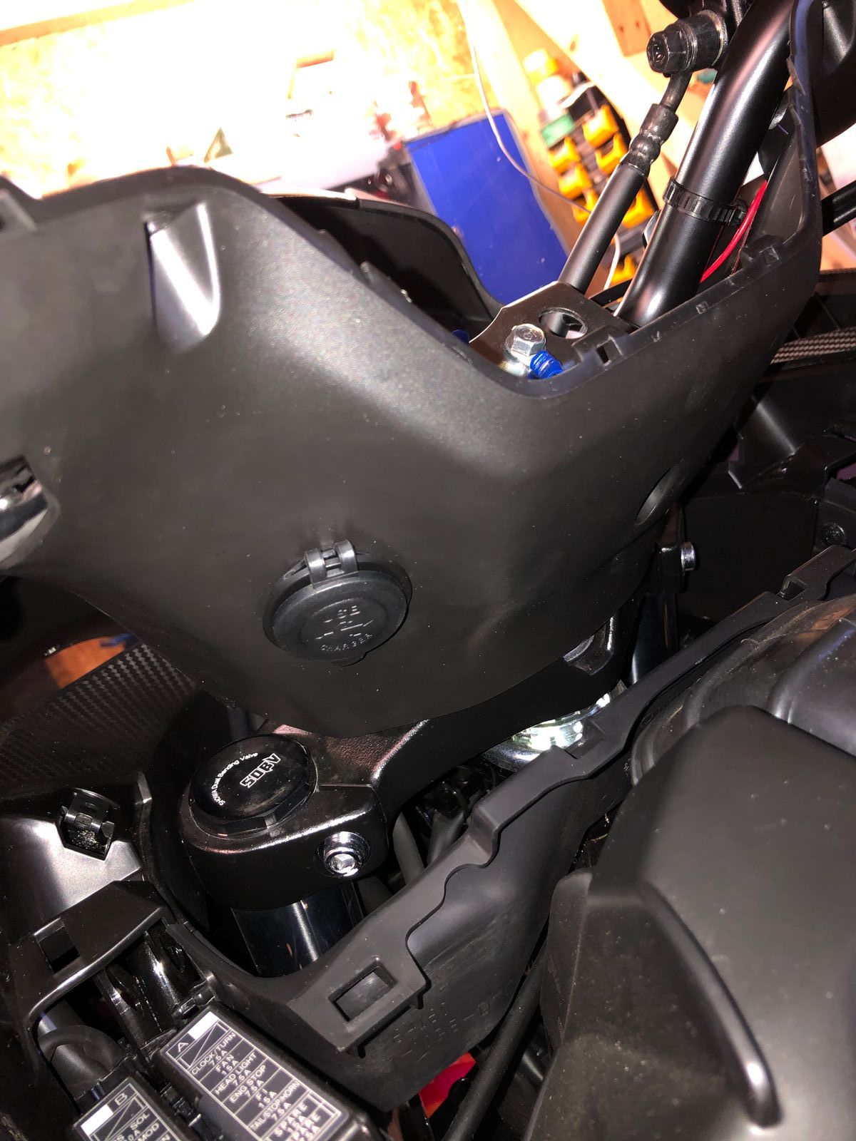 Wenn ich das richtig verstanden habe, verwendest Du das "schwarze Bremslichtkabel" als die +12V-Versorgung für Heizgriffe und USB-Buchse? Wo greifst Du die Masse ab? Vom Lenker über die blauen Ringkabelschuhe in Bild 4?
