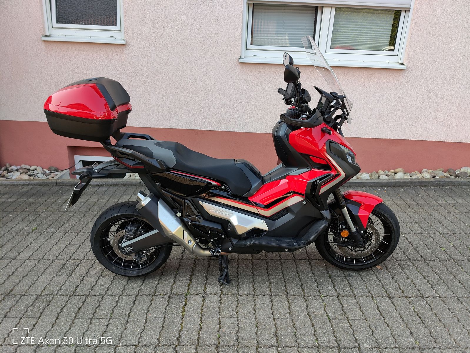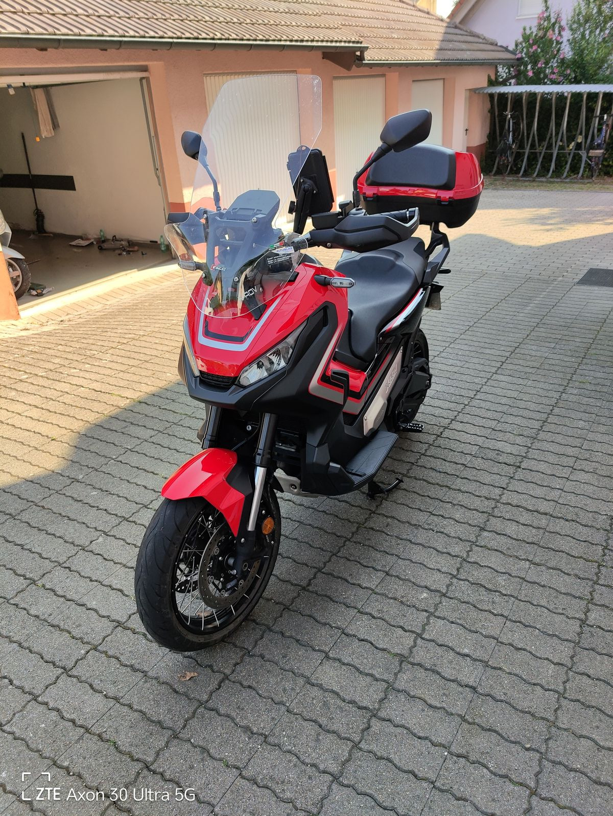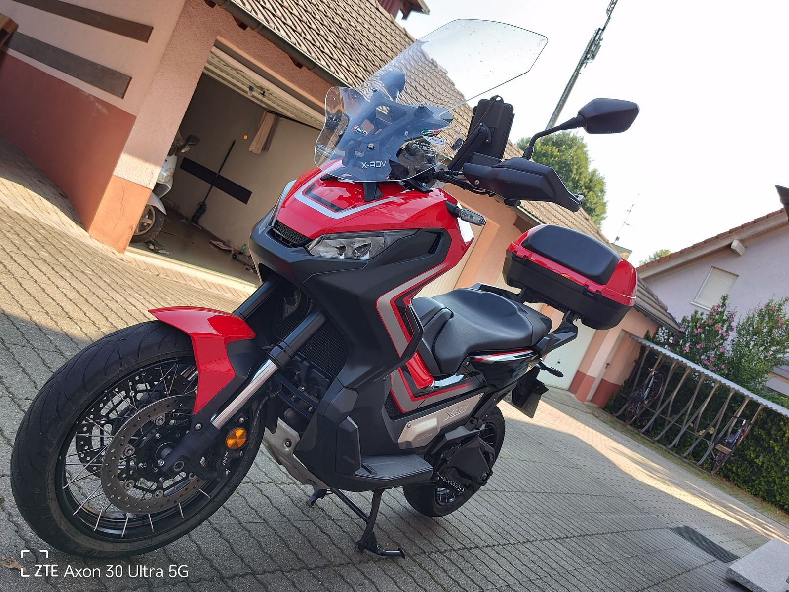 HONDA TEXT: Honda X-ADV 750 DCT mit Doppelkupplungsgetriebe !(DCT, schalten per Fingertipp Eine Crossover-Maschine mit guter Geländegängigkeit. Es ist schwer, etwas völlig Neues zu erschaffen, doch mit dem X-ADV ist uns genau das gelungen. Geplant und umgesetzt von unserem italienischen Forschungs- und Entwicklungs-Team bringt er frischen Wind in unser Adventure-Modellprogramm. Der X-ADV ist unverkennbar. Mit einer ungewöhnlichen Kombination aus Raffinesse und Robustheit sticht er als Gesamtkonzept aus der Masse heraus und gründet damit eine völlig neue Fahrzeugklasse. Herzstück des X-ADVs ist ein 745-ccm-Zweizylindermotor, der genug Drehmoment für den Stop-n-Go-Verkehr in der Stadt bietet und gleichzeitig ausreichend Drehzahl für Geländefahrten bereitstellt. Durch die Kombination mit dem Doppelkupplungsgetriebe DCT ähnlich jenem der Africa Twin wird auf allen Untergründen ohne Zugkraftunterbrechung geschaltet. Gelände oder Asphalt Sie haben die Wahl. Auf und davonDer X-ADV ist bereit, wenn der Ruf nach Abenteuer ertönt. Drücken Sie einfach den G-Schalter und los geht's. SPASS HABEN Ein Motorrad, das sich wie ein SUV verhält und das auch abseits der Stadt eine gute Figur macht.Der wendige X-ADV fühlt sich im täglichen Stadtverkehr pudelwohl und am Wochenende können Sie mit ihm entfernte Ziele anvisieren. Eine gute Sicht Nehmen Sie Platz Ideale Proportionen für die Fahrt alleine oder zu zweit und hochwertige Materialien sorgen dafür, dass Sie auch auf langen Touren keinen Komfort missen. Die Sitzbank hat die ideale Höhe für Stadt- wie Überlandfahrten und bietet hervorragende Sicht bei aufrechter Sitzposition. Handprotektoren Ohne die Handprotektoren wäre es kein richtiges Crossover-Bike. Es sind die gleichen wie bei der Africa Twin und sie dienen nicht nur der Optik: Die Hände werden vor Wind und Wetter sowie bei Offroadfahrten vor Steinen oder Schmutz geschützt. Verstellbarer Windschirm Der Windschirm des X-ADVs ist ohne Werkzeug in fünf Stufen höhenverstellbar und bietet idealen Schutz vor Wind und Wetter.
