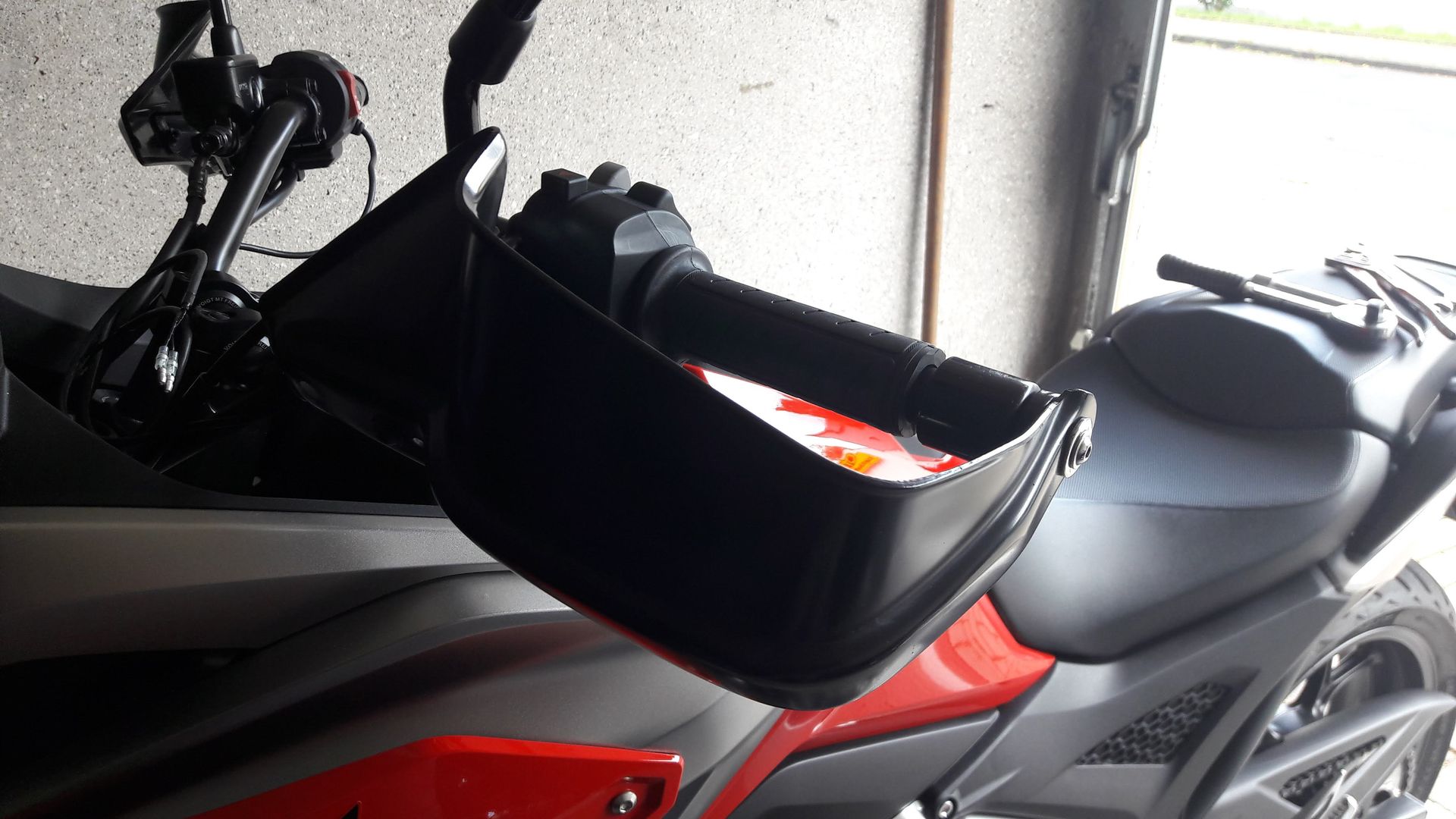 Die Handprotektoren sind von Givi und waren an meiner vorherigen NC montiert. Ich hatte sie gekürzt so dass sie um 25 mm näher an den Lenker herankommen. Dafür war die Bohrung zur Halterung am Lenkerende und die Haltebleche am Rückspiegel zu verändern. Der Kupplungshebel kommt jetzt gerade eben an den linken Handprotektor, mal schauen wie sich das im Fahrbetrieb auswirkt. Vielleicht schau ich da noch nach einem anderen Kupplungshebel.