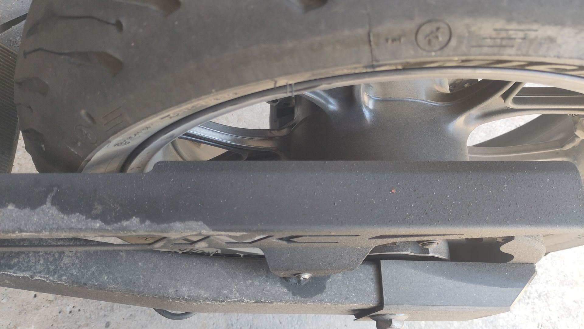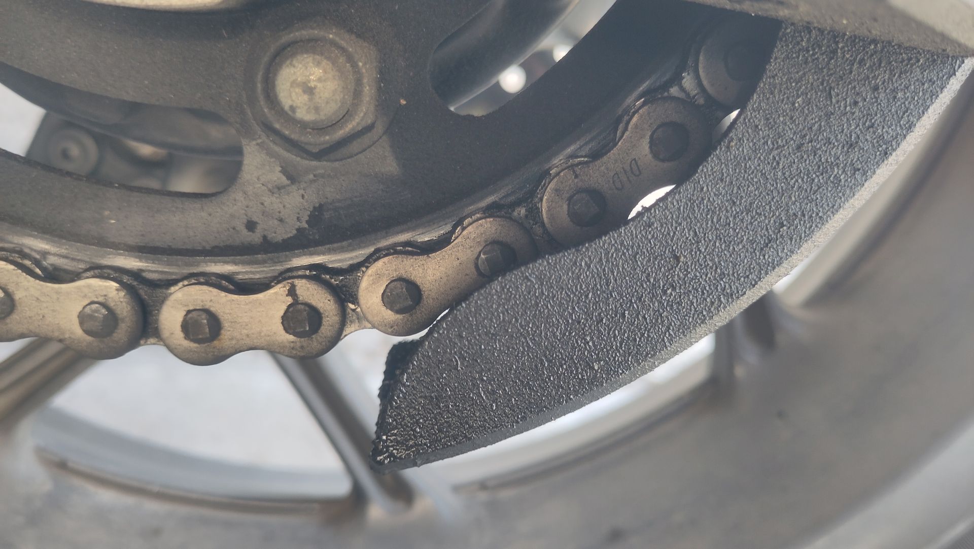 Den Kettendurchhang habe ich heute nach 4.100 km erneut eingestellt. Dazwischen habe ich das Motorrad nicht gewaschen oder die Kette und das Umfeld geputzt. Nur 2 bis 3 mal bin ich kurz bei nasser Straße oder im Regen gefahren. Es konnte sich also jede Menge Schmutz ansammeln. An meiner NC ist ein Scottoiler E-System verbaut, das Tropfintervall habe ich bei 90 s stehen, so konnte auch einiges an Öl abgeschleudert werden.