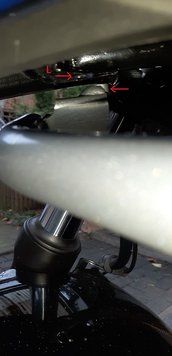 Lt. Original Anleitung erst mit Schelle an der linken Seite des Rahmens locker montieren, dann imt einer Schraube und Mutter an der vorhandenen Bohrung unterhalb des Scheinwerfers ebenfalls locker montieren.