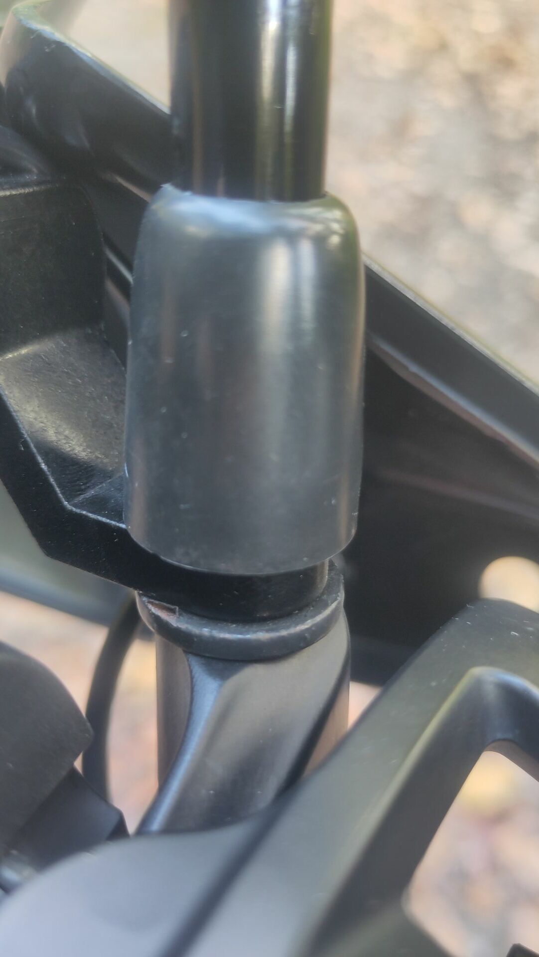 Unter der Spiegelbefestigung sitzen nun die Halter für den Schalter und den Handschutz. Dadurch ist das 10-er Gewinde der Spiegelbefestigung, welches in die Parkbremse geschraubt wird, recht kurz. Deshalb habe ich oberhalb des Gewindes den runden Teil auf etwa 3 mm Länge auf 10 mm Durchmesser abgedreht und die 10-er Bohrung des Schalterhalters auf etwa 3 mm Tiefe auf 14 mm aufgebohrt. Damit ist das Gewinde wieder lang genug. Habe im Bild den Bereich mal Rot gekennzeichnet.
