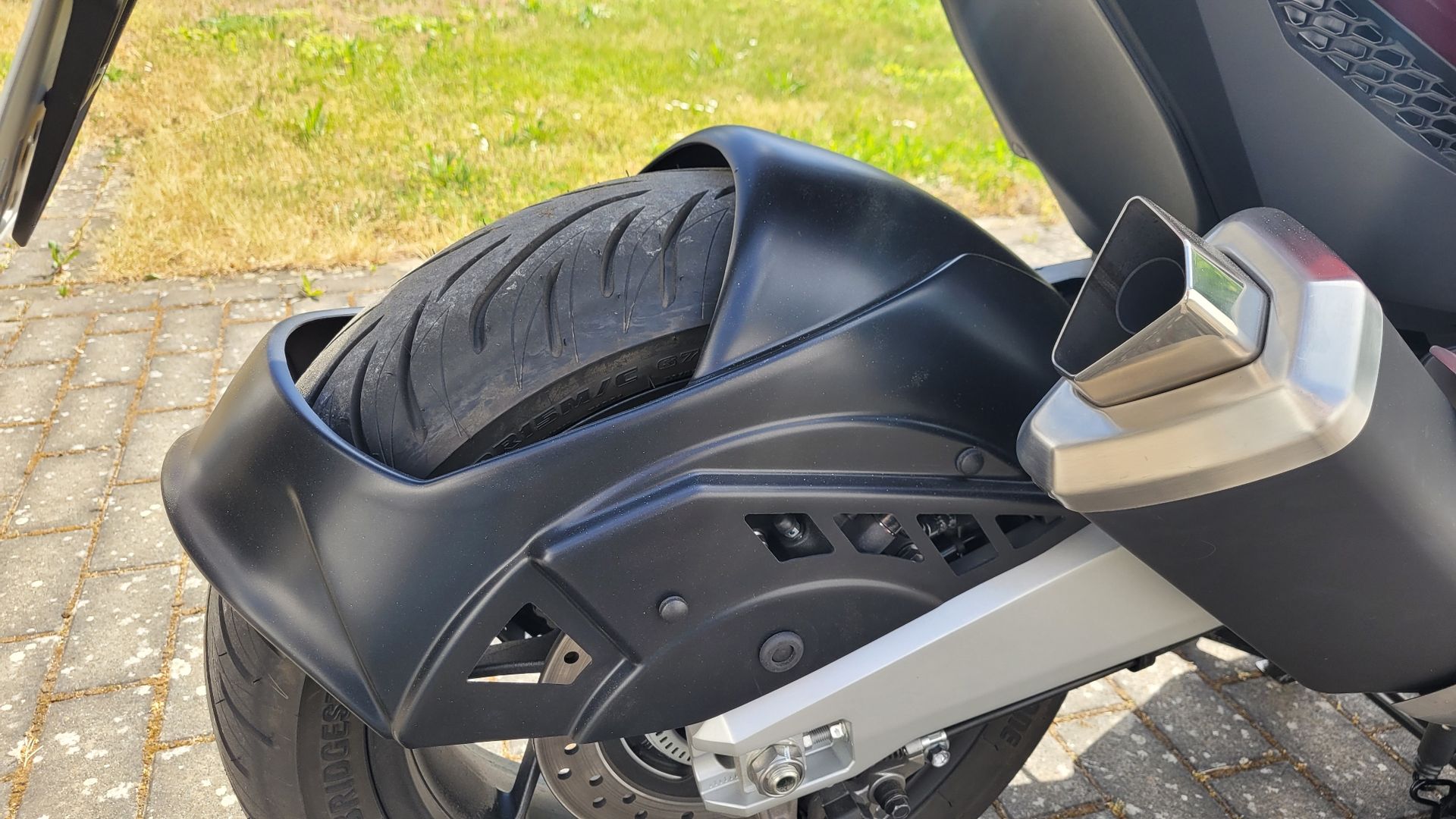 Die erste Änderung. Da ich mich mit einem so offen zur Schau gestellten Hinterrad nicht anfreunden konnte, habe ich besagte Abdeckung montiert. Montage war recht einfach. Teil ist passgenau, Material war komplett und ein Anbauvideo gibts auch im Netz.