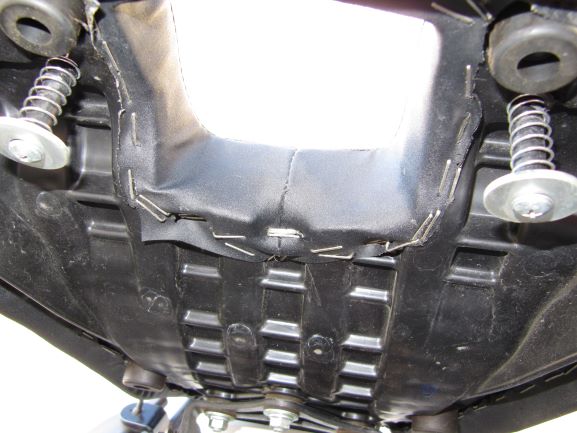 Die hintere Sitzbank wurde von unten ausgehöhlt, damit der Sattler die Konturen sieht. Zunächst habe ich über dem Tankdeckel in die Bank vier Löcher an den Eckpunkten gebohrt und dann mühsam den doch recht dicken Kunststoff herausgeschnitten und die Ränder geglättet.