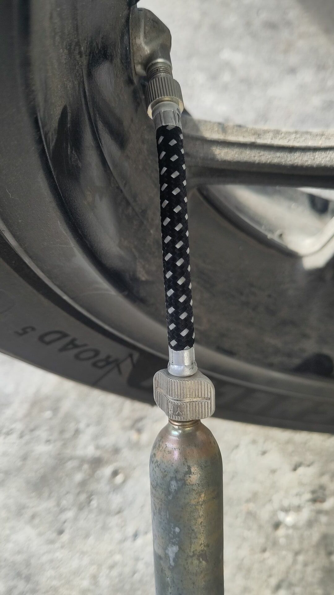 Es ist ein kurzer Schlauch, der runde Anschluss wird auf das Ventil geschraubt und in den Anschluss mit den Flügeln wird die CO2-Patrone eingeschraubt. Das hat funktioniert, alles war dicht und das CO2 ist im Reifen gelandet.