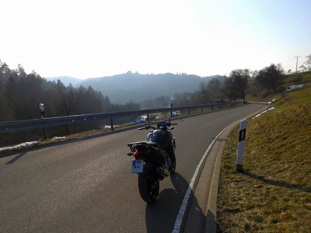Die Seidenunterhandschuhe haben da auch nix mehr genützt. Schwäbischer Wald - noch relativ weiß, schon einige Mopeds unterwegs, aber auf den Waldpassagen noch sehr nasse Strassen und rutschige Kurven. Das dauert noch ein paar Wochen, bis es alles mal durchgewärmt ist. Genau wie ich - heißes Bad, ich komme!!