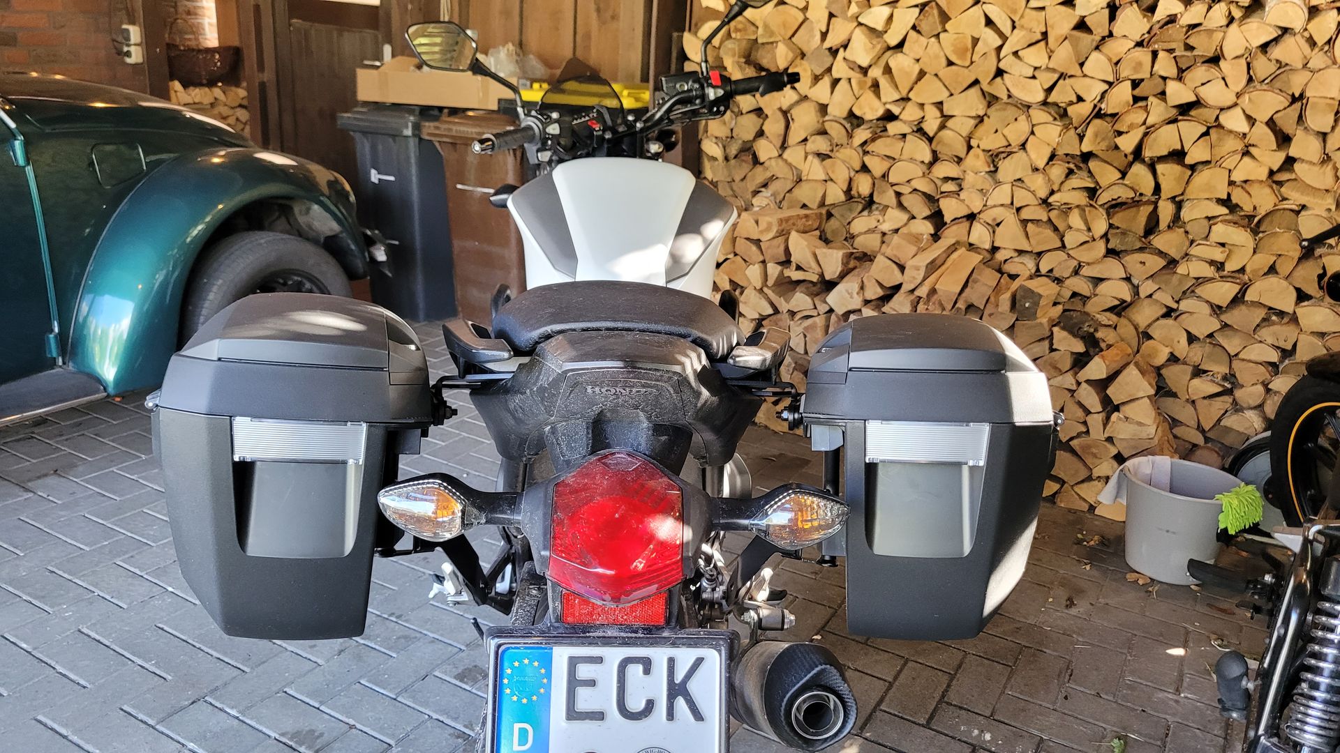 Die NC steht vorne im Carport neben meinem Auto, dahinter die Enfield, die mich morgen zur Arbeit bringt.
