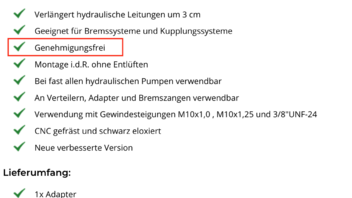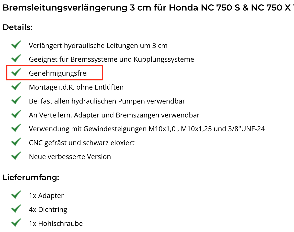 Die Bremsschlauchverlängerung ist ABE - frei, alles ok. Nur die Lenkererhöhung braucht die mitgelieferte ABE.
