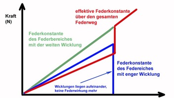 Deshalb ist die Feder an der NC (zwei Bereiche mit unterschiedlichen Wicklungsdichte) eine lineare Feder mit zwei Konstanten-Bereichen.