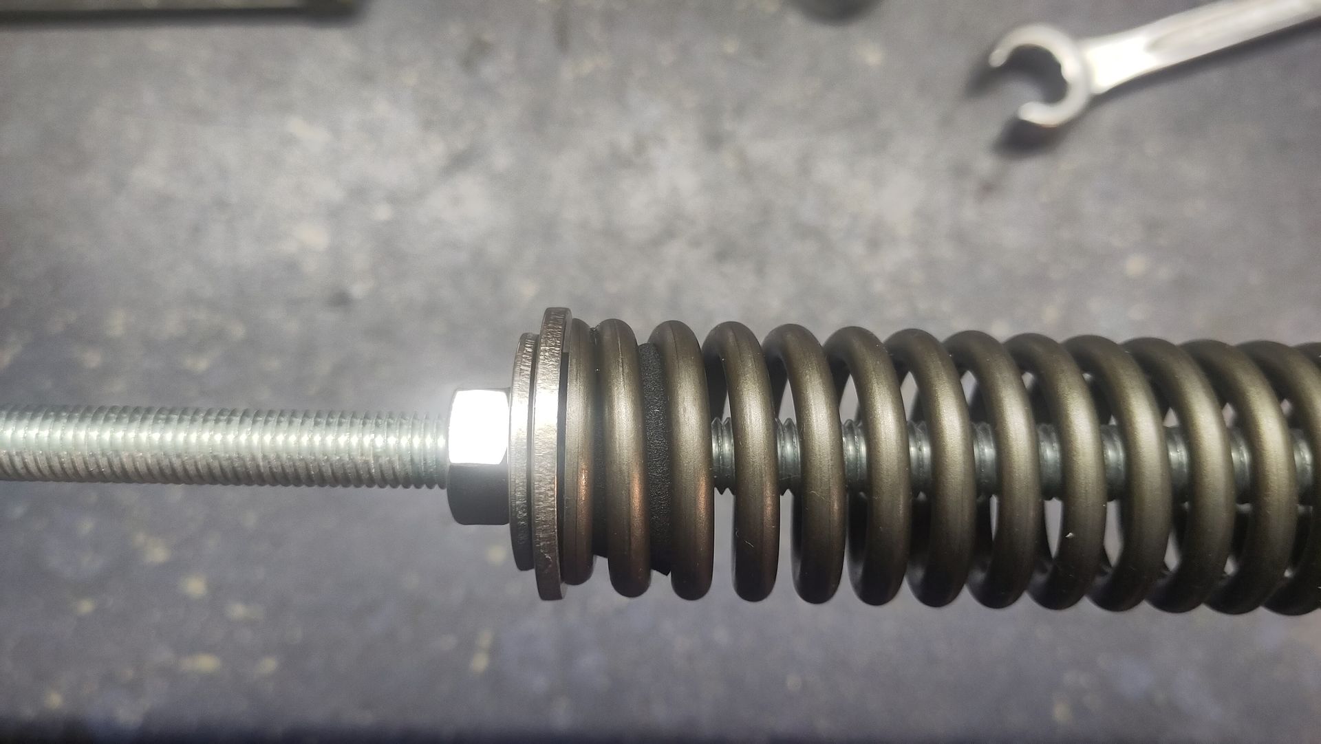 An einer 10-er Gewindestange fixierte ich zwischen zwei Muttern eine große U-Scheibe, dann noch auf einer Seite eine Hülse daran geschoben und mit einer Mutter fixiert. Nun die Feder auf die Gewindestange geschoben bis sie an der U-Scheibe anliegt und von der Hülse zentriert wird. Am anderen Ende ebenfalls eine große U-Scheibe bis an die Feder geschoben und mit einer Mutter fixiert. Die Gewindestange im Schraubstock eingespannt und dann die Mutter gedreht bis die Feder um 15 mm zusammen gedrückt ist. Dies entspricht in etwa der Vorspannung in der Gabel, um 5 mm mehr oder weniger brauchen wir jetzt und hier nicht diskutieren.