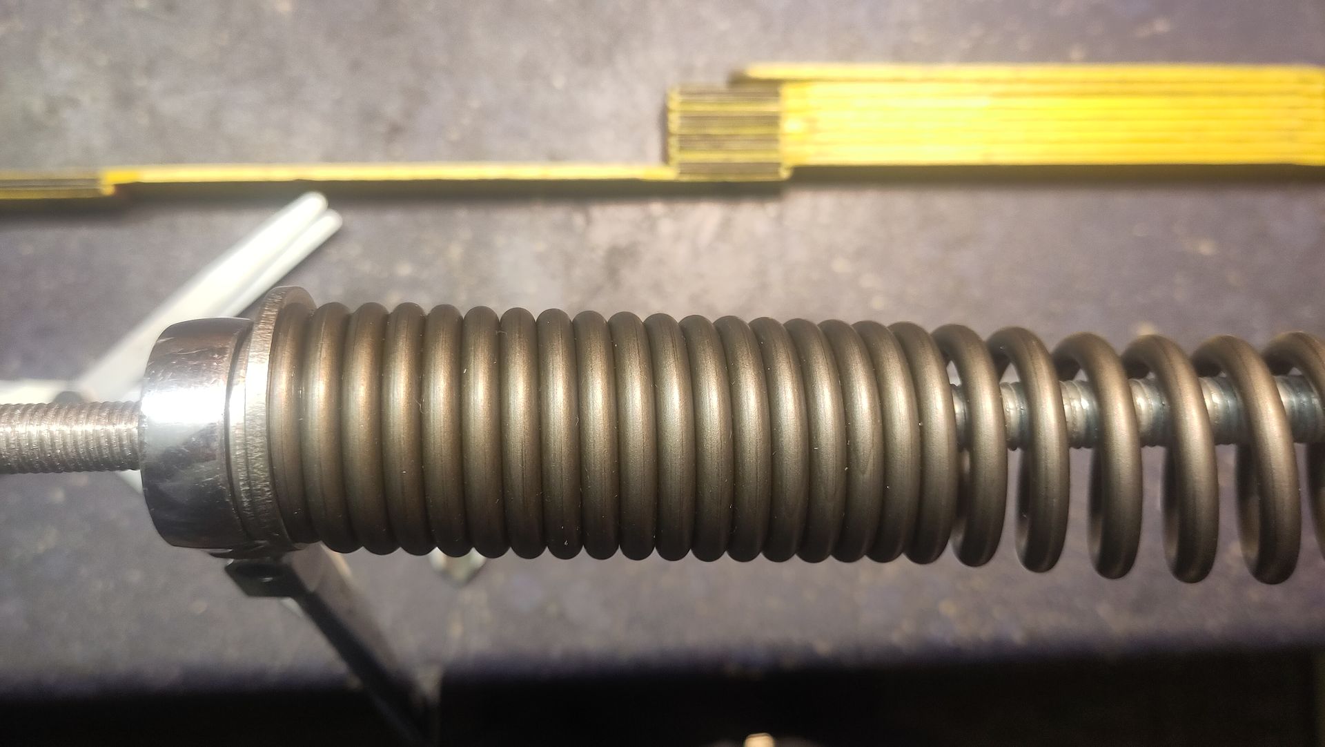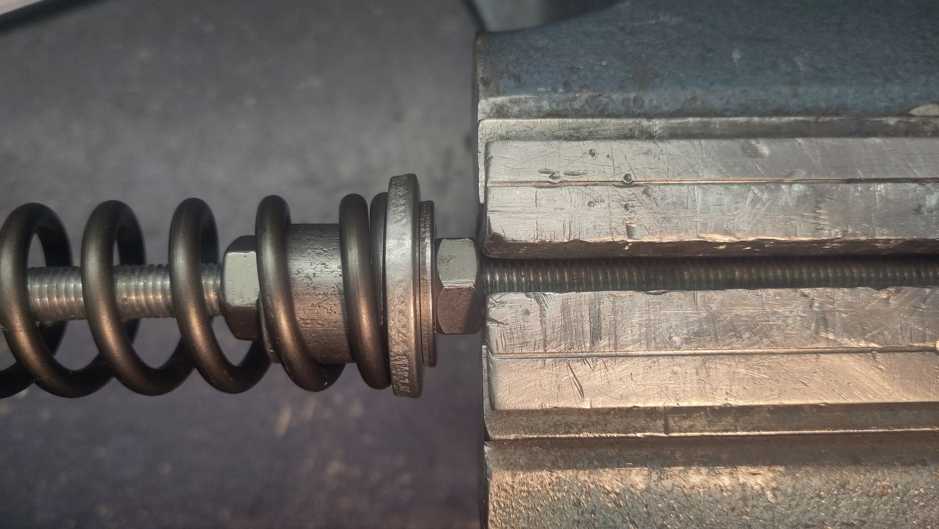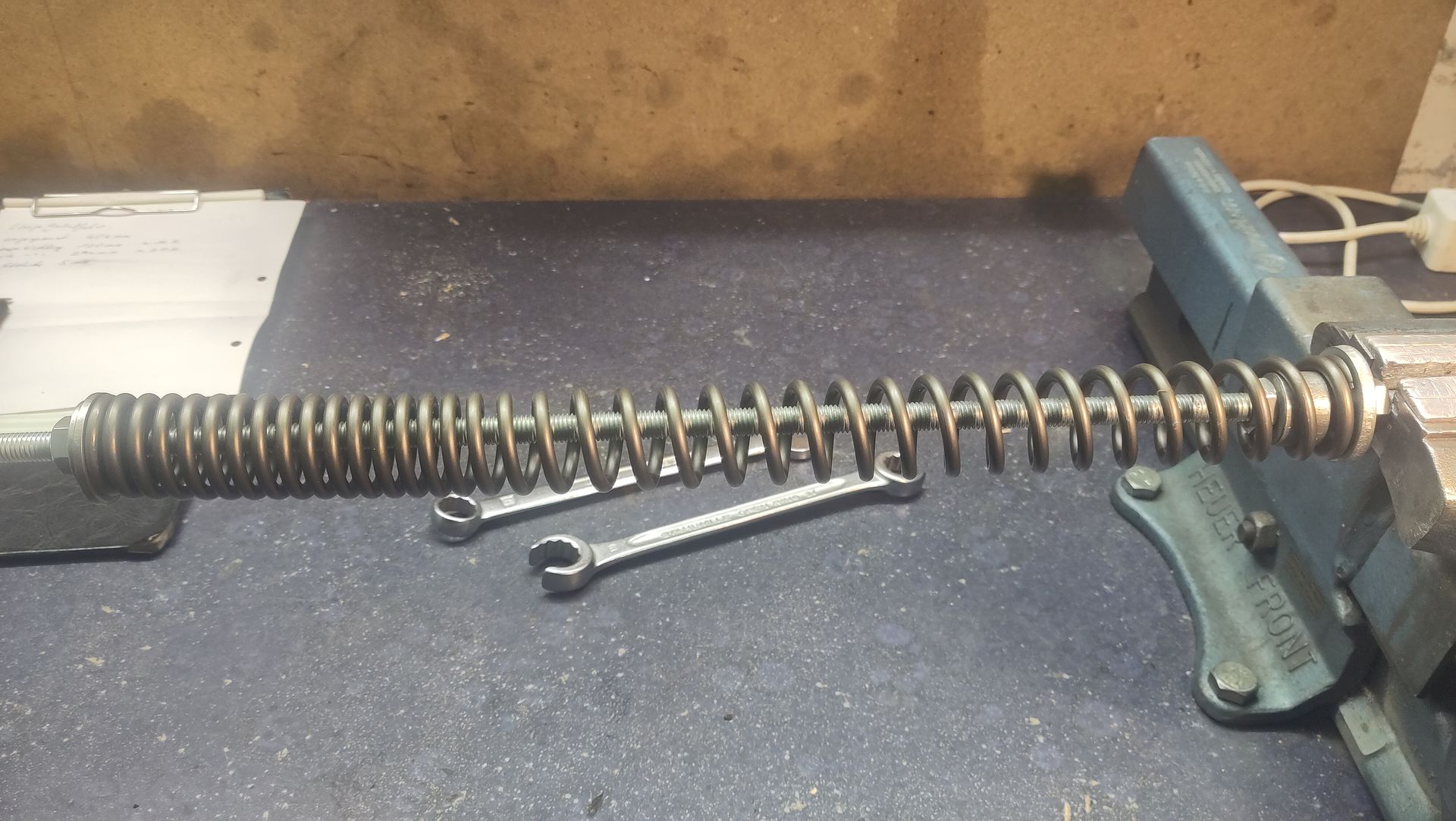 An einer 10-er Gewindestange fixierte ich zwischen zwei Muttern eine große U-Scheibe, dann noch auf einer Seite eine Hülse daran geschoben und mit einer Mutter fixiert. Nun die Feder auf die Gewindestange geschoben bis sie an der U-Scheibe anliegt und von der Hülse zentriert wird. Am anderen Ende ebenfalls eine große U-Scheibe bis an die Feder geschoben und mit einer Mutter fixiert. Die Gewindestange im Schraubstock eingespannt und dann die Mutter gedreht bis die Feder um 15 mm zusammen gedrückt ist. Dies entspricht in etwa der Vorspannung in der Gabel, um 5 mm mehr oder weniger brauchen wir jetzt und hier nicht diskutieren.