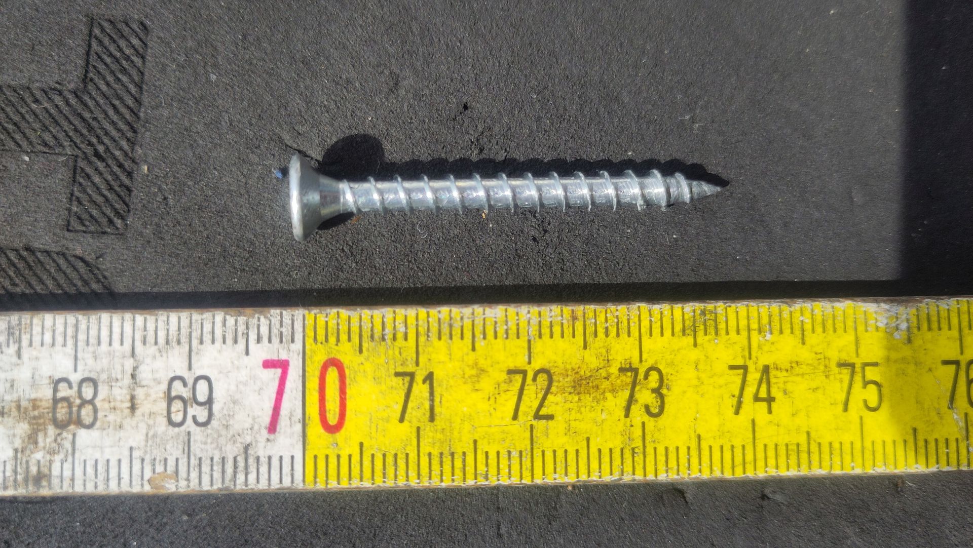 Ich fuhr mit gut 50 km/h eine leichte Rechtskurve und sah in meiner Fahrspur etwas längeres Silbernes liegen. Weil ich darauf schaute fuhr ich natürlich auch darüber. Es gab ein deutlich hörbares unschönes Geräusch und nachdem ich angehalten hatte sah ich die Bescherung. Es schaute nur noch der Kopf der Spaxschraube aus dem rechten Bereich der Lauffläche des Hinterreifens.