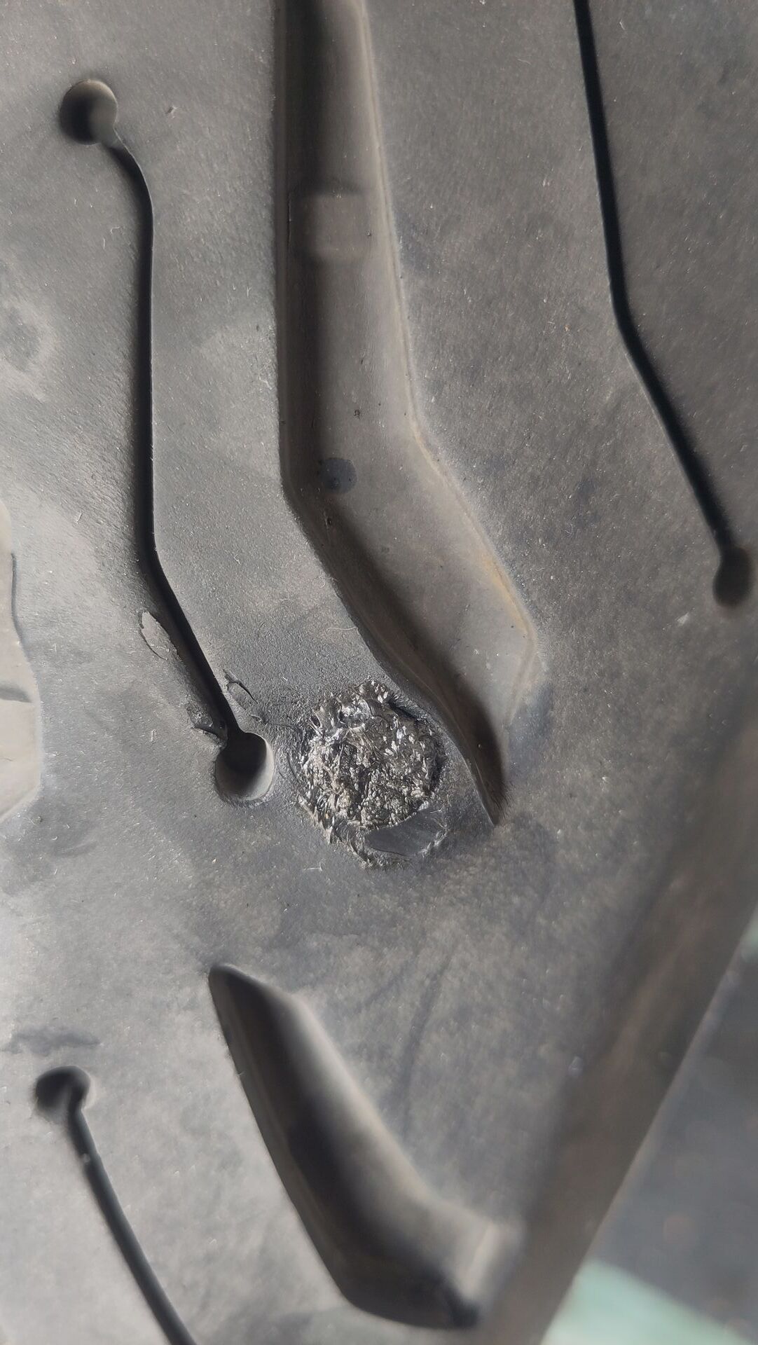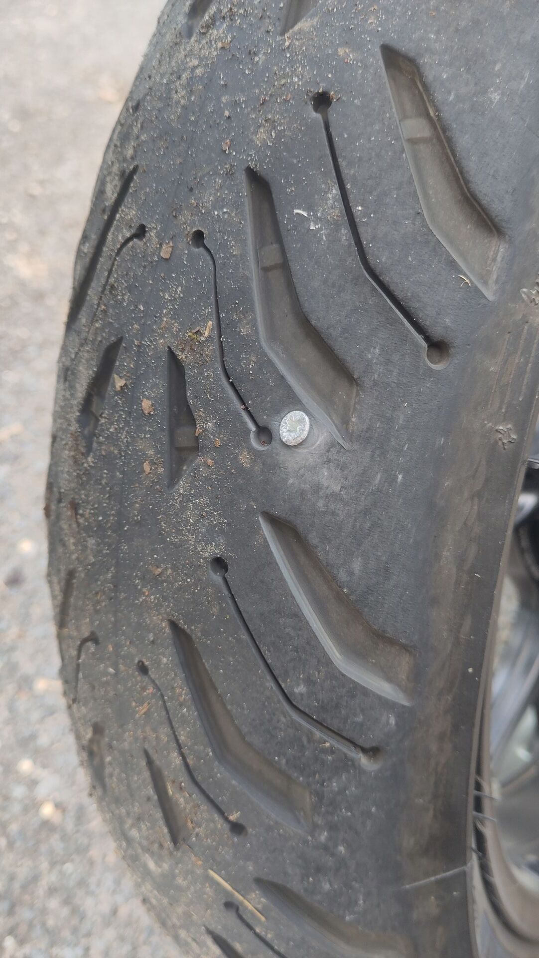 Ich fuhr mit gut 50 km/h eine leichte Rechtskurve und sah in meiner Fahrspur etwas längeres Silbernes liegen. Weil ich darauf schaute fuhr ich natürlich auch darüber. Es gab ein deutlich hörbares unschönes Geräusch und nachdem ich angehalten hatte sah ich die Bescherung. Es schaute nur noch der Kopf der Spaxschraube aus dem rechten Bereich der Lauffläche des Hinterreifens.