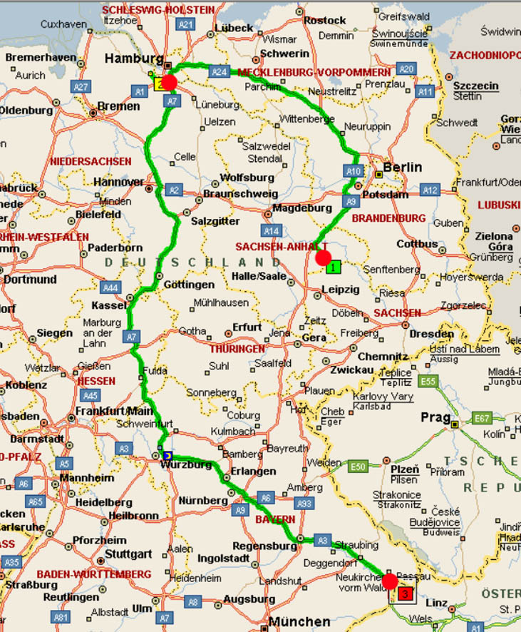 Der "Anzeigenhauptmeister" fährt in seiner selbstgewählten Dienstuniform von Gräfenhainichen (bei Bitterfeld) nach Buxtehude (Niedersachsen), um dann nach Passau weiterzureisen (s.Reiseroute).