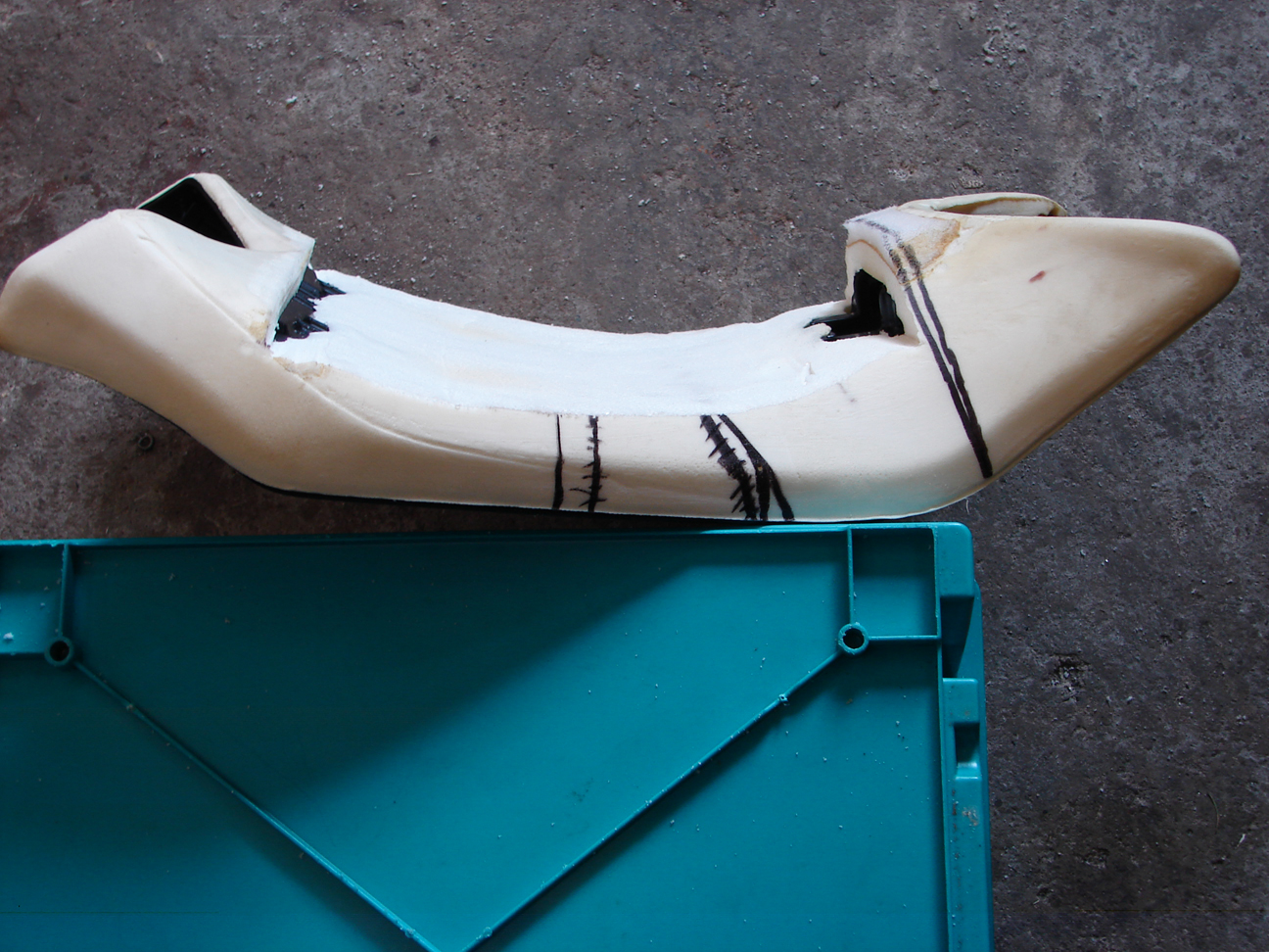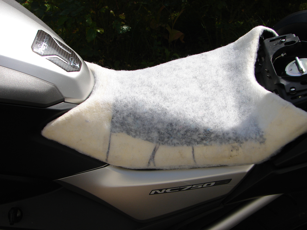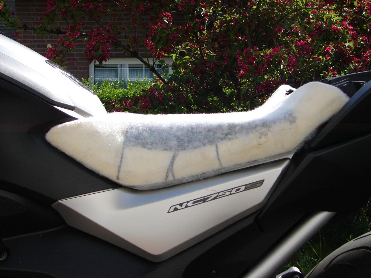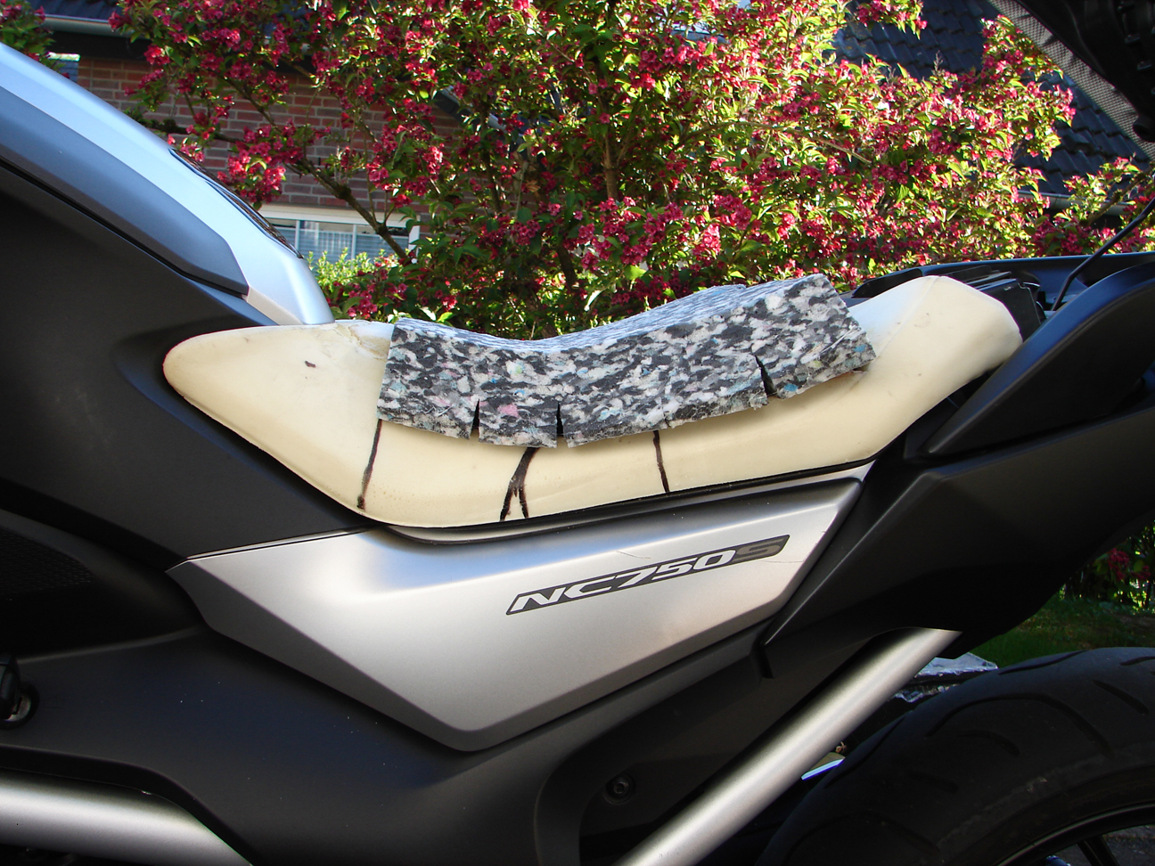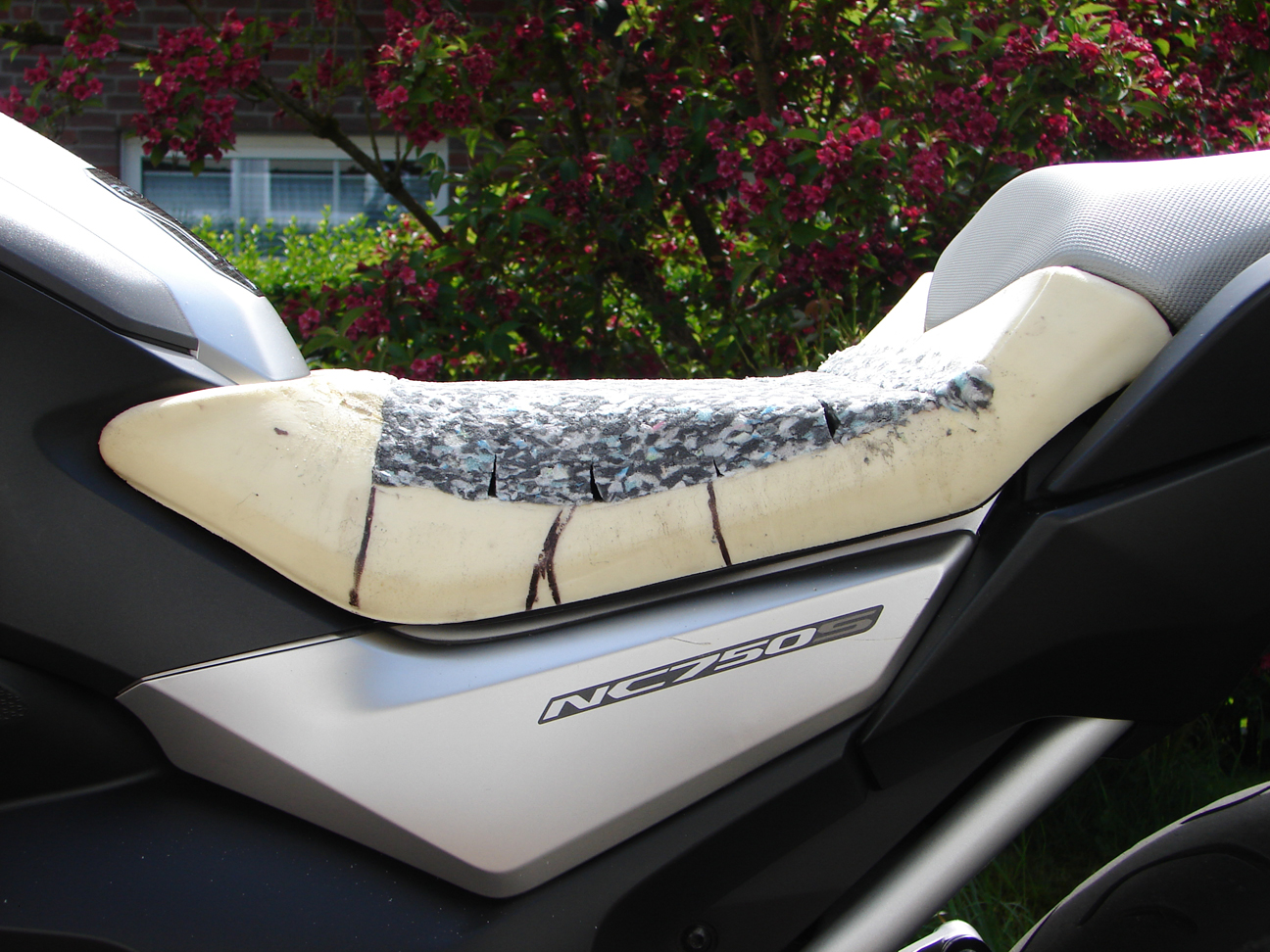 leicht andrücken. Wenn der Schaum eingepasst ist schnell Zeitungspapier auf die Sitzbank legen und ab aufs Moped und den Schaum