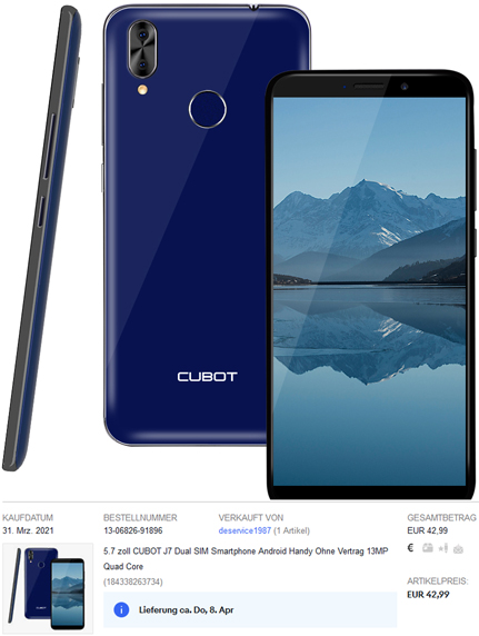 Es handelt sich um ein CUBOT J7 (siehe Foto) Ein paar Eckdaten: