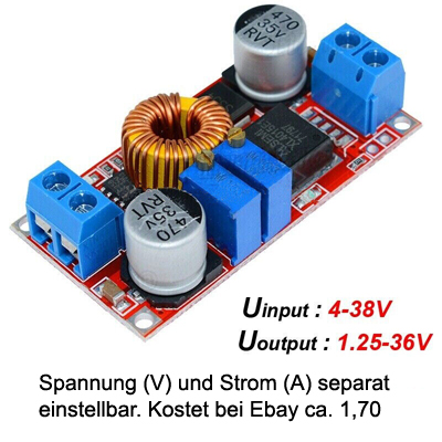 Für die USB-Stromversorgung habe ich einen Step-up-down-Wandler genommen (siehe Foto) und auf 5Volt und 1,0Ampere eingestellt.
