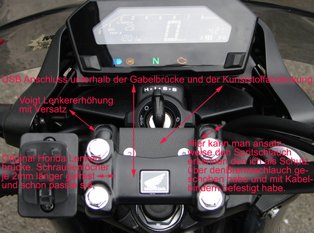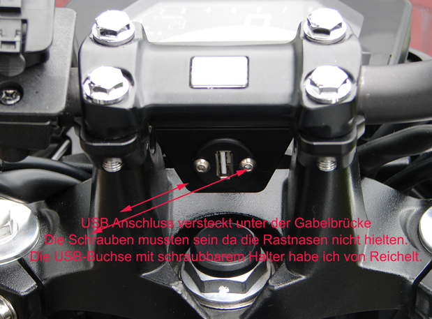 Jetzt noch eine USB-Buchse mit Halter von Reichelt schön versteckt unter der Lenkerbrücke verbaut. (Siehe Fotos, die hatte ich noch von