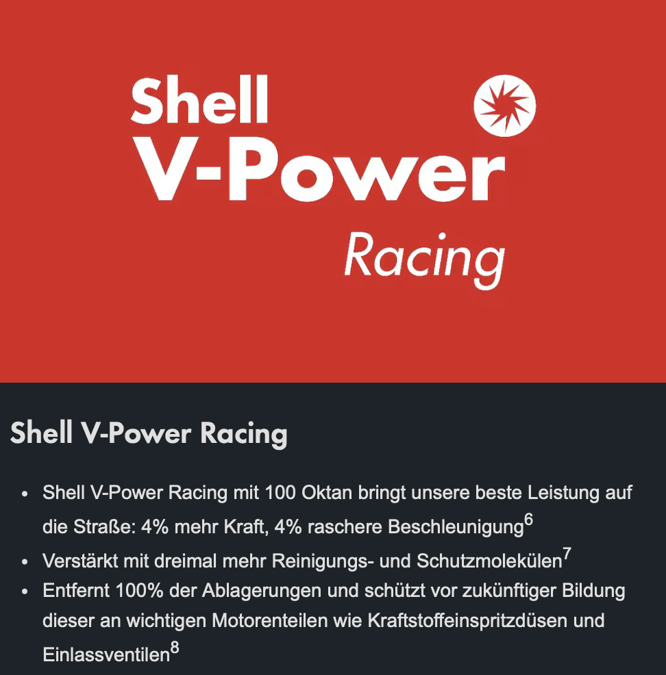Ich hatte die Idee, einmal V-Power zu tanken. Das Versprechen siehe Screenshot: