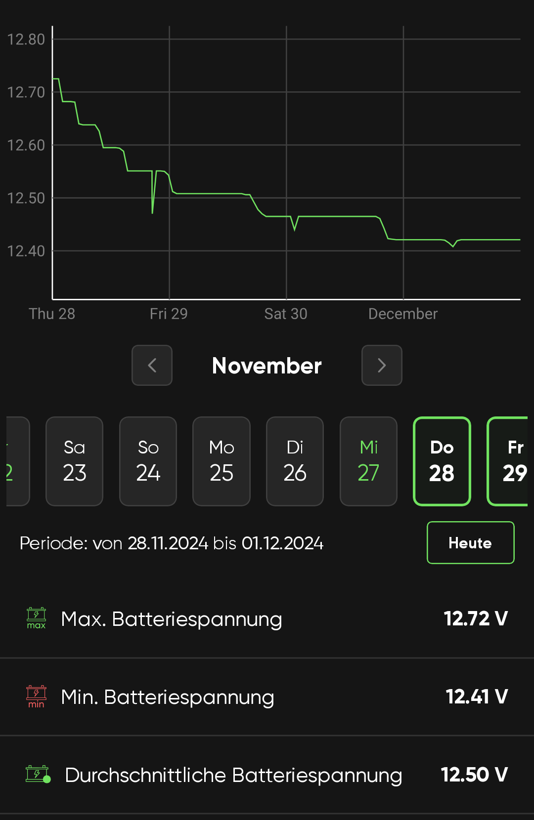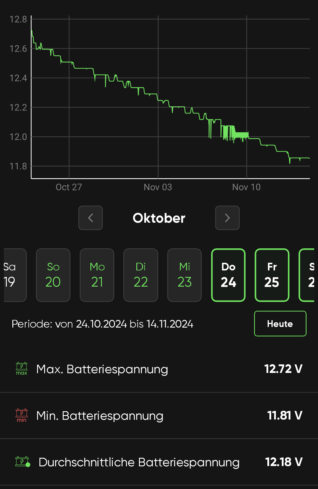 Trotzdem bleibt das Problem bestehen: Die Batterie entlädt sich immer noch viel zu schnell. Nach vier Tagen Standzeit liegt die Spannung nur noch bei etwa 12,4 Volt, was ja schon nicht optimal ist für eine Gel-Batterie. Also womöglich ist die neue Batterie bereits beschädigt, da sie im Frühjahr einmal tiefenentladen wurde. Oder es ist eine Problem des Motorrads.