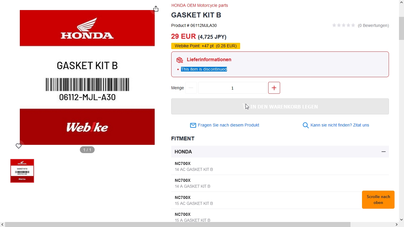Kleiner Tipp, wenn du bei "Webike" etwas bestellen willst gehe vorher auf "https://www.bike-parts-honda.de/" suche dir die
