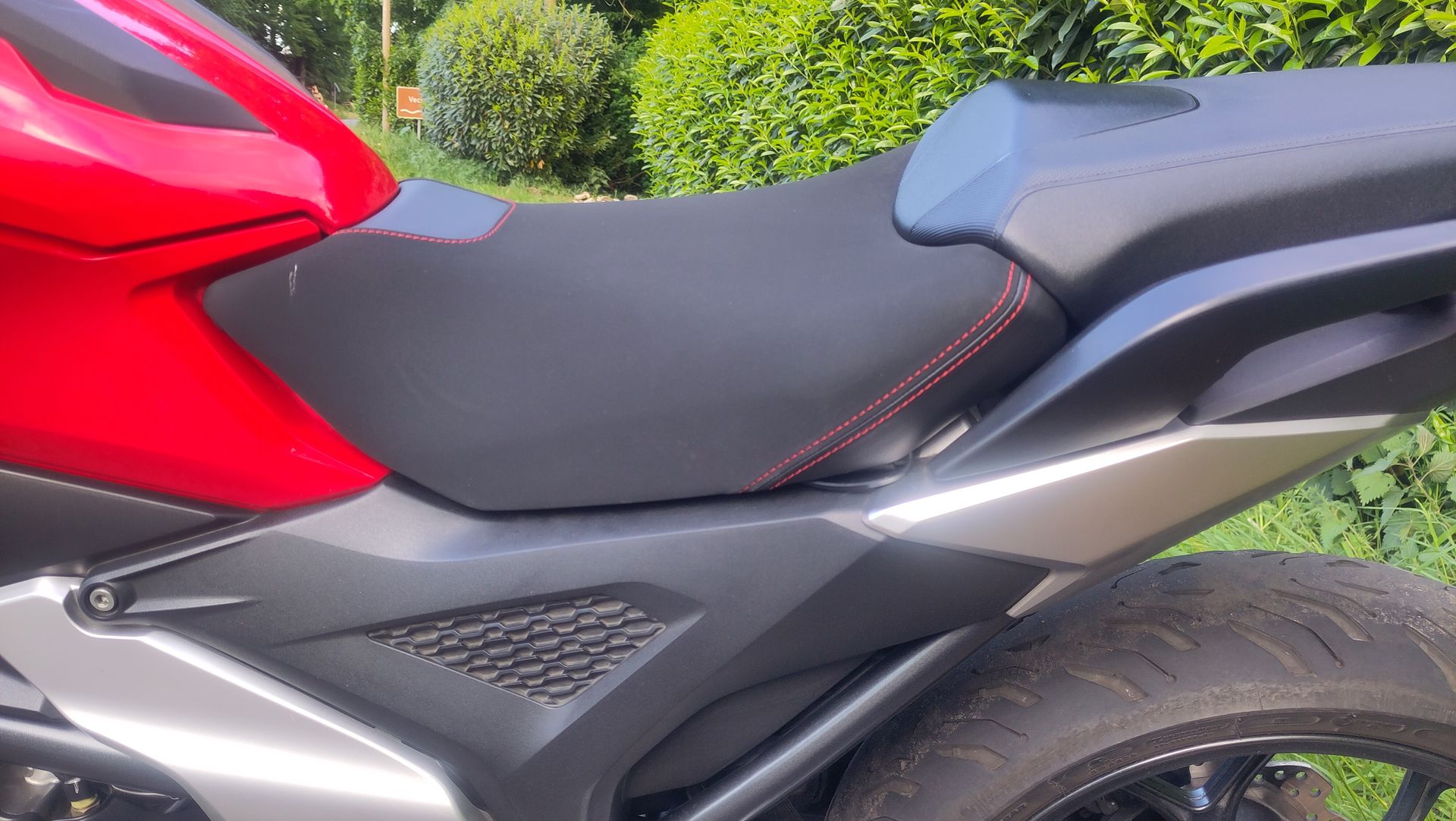 #130 Nachdem hier so viel von dem neuen Komfortsitz geschwärmt wurde dachte ich mir den probiere ich auch mal auf meiner RH09 aus. Am Montag bestellt und am Freitagmittag war das Paket da. Den Fahrersitz drauf gebaut und bis auf die bereits erwähnten seitlichen Lücken, die mich aber nicht weiter stören, passt er problemlos. Der Abschluss oben am Helmfach ist perfekt, der Beifahrersitz muss jetzt etwas kräftiger in seine Rastung gedrückt werden. Die roten Nähte passen gut zum Rot meiner NC.