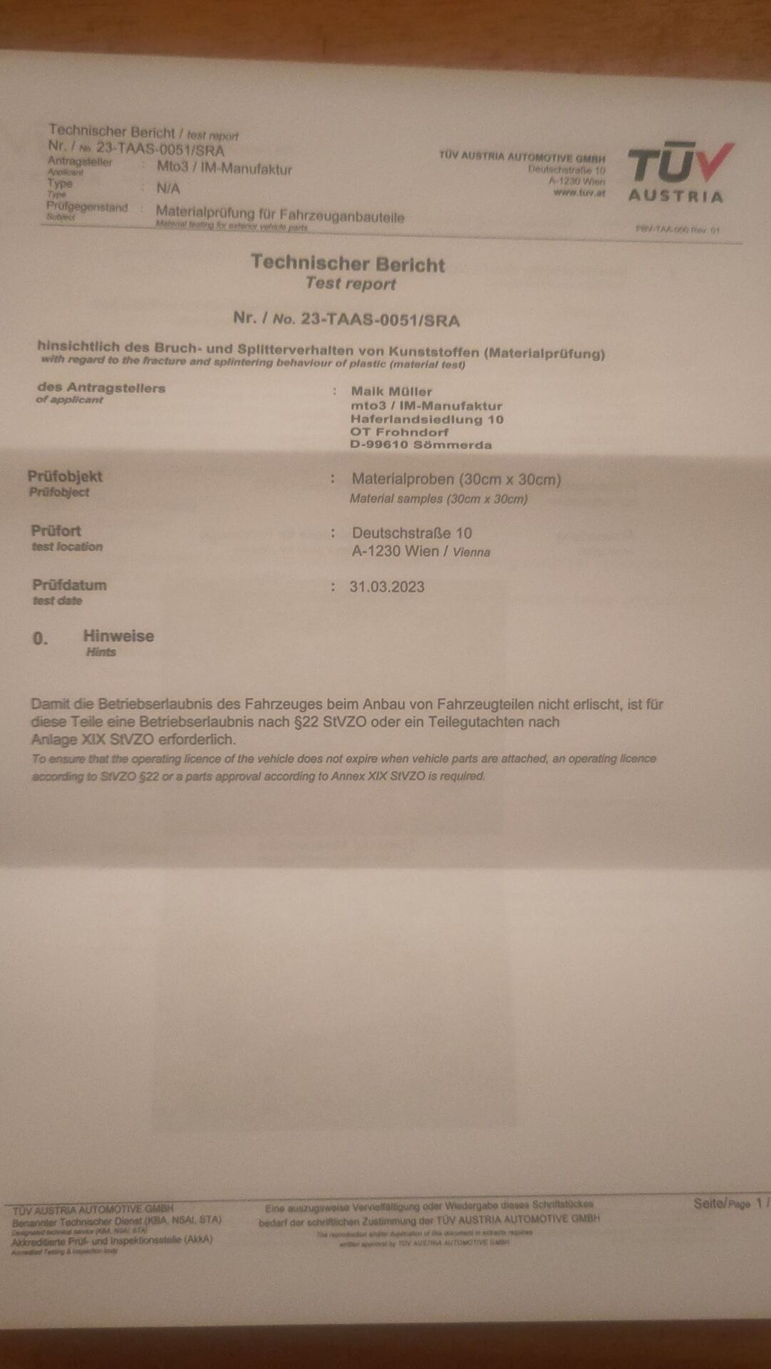 Für den Carbon-Kettenschutz gibt es ein technisches Gutachten, damit sollte eine Eintragung kein Problem sein. Auf den Bildern erste und letzte Seite des Gutachtens.