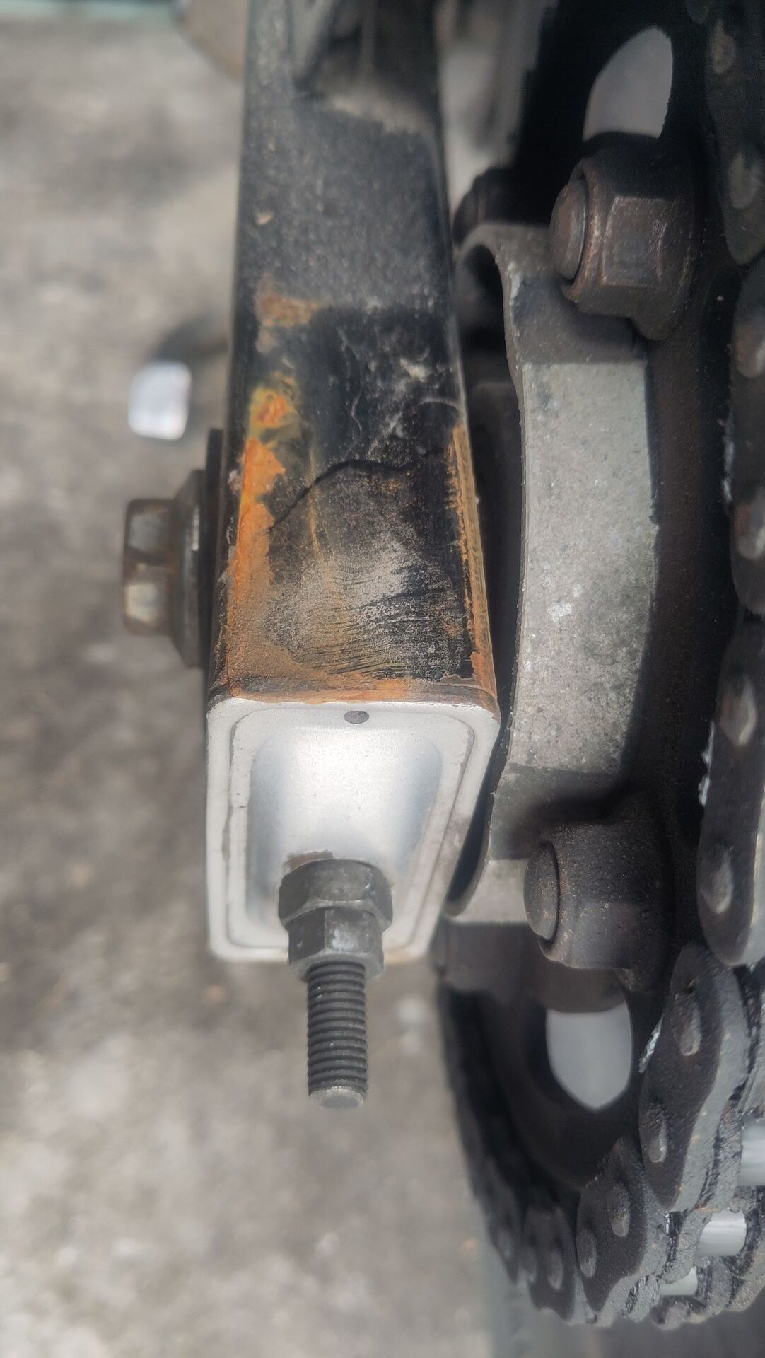 Habe mal zwei Fotos gemacht. Insbesondere auf der oberen Seite der Schwinge ist die Farbe an den Kanten abgescheuert und auf der Fläche teilweise angescheuert.