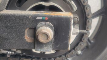 Die Außenseite der Schwinge ist durch den Spritzschutz nicht so stark in Mitleidenschaft gezogen. Der Farbverlust am vorderen Ende der Achsdurchführung kommt wahrscheinlich vom Radein- und ausbau. Die Achsmutter hat auch gelitten durch häufiges lösen und anziehen.