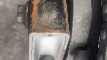 Habe mal zwei Fotos gemacht. Insbesondere auf der oberen Seite der Schwinge ist die Farbe an den Kanten abgescheuert und auf der Fläche teilweise angescheuert.