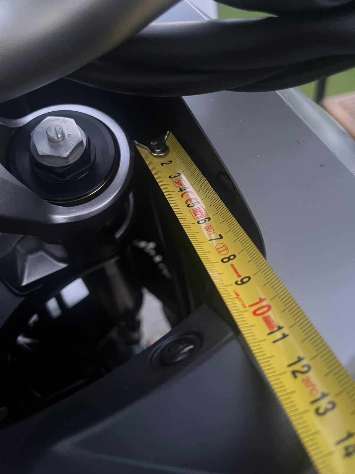 Weiterhin habe ich den Abstand Gabel links und rechts zur Verkleidung geprüft. Mit dem Maßband konnte ich feststellen, dass der Abstand Gabel zu Verkleidung auf der rechten Seite größer ist als links. Auf der rechten Seite komme ich mit dem Maßband gar nicht erst zwischen Gabel und Verkleidung.