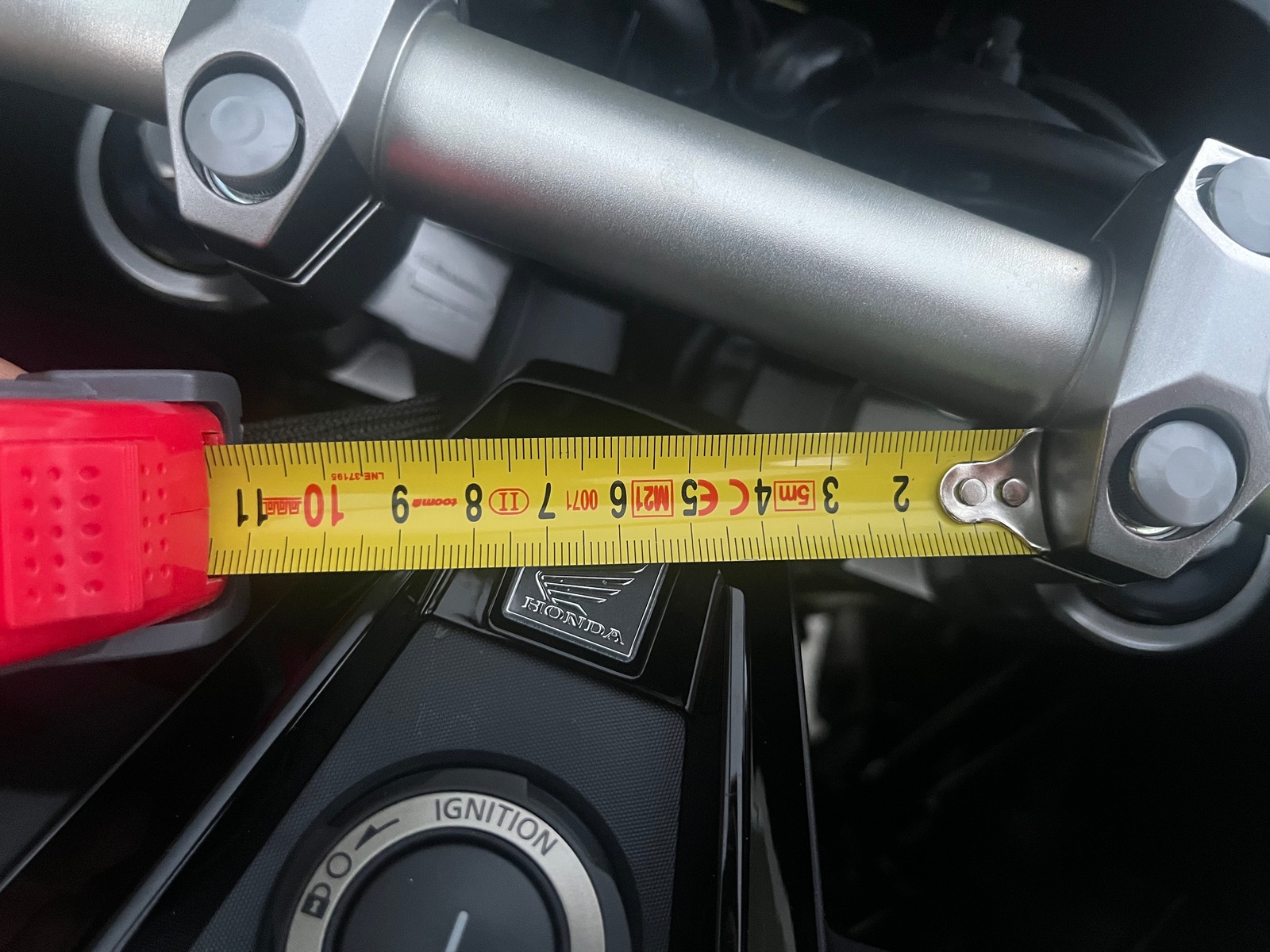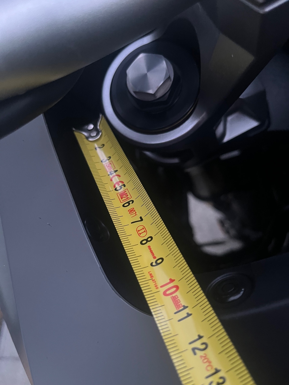Weiterhin habe ich den Abstand Gabel links und rechts zur Verkleidung geprüft. Mit dem Maßband konnte ich feststellen, dass der Abstand Gabel zu Verkleidung auf der rechten Seite größer ist als links. Auf der rechten Seite komme ich mit dem Maßband gar nicht erst zwischen Gabel und Verkleidung.